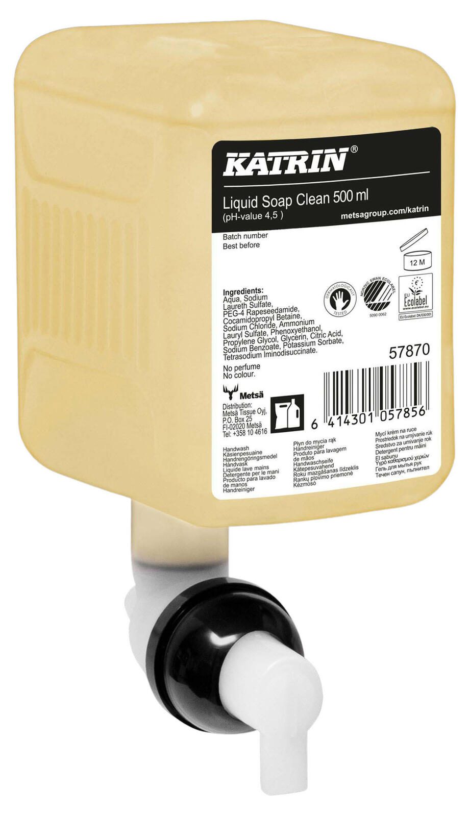 Die KATRIN Flüssigseife 0,5 l ist die ideale Wahl für alle, die Wert auf sanfte und effektive Handreinigung legen. Diese hochwertige Flüssigseife zeichnet sich durch ihren neutralen Duft aus, der ein angenehmes Wascherlebnis bietet, ohne aufdringlich zu sein. Mit einem pH-Wert von 4,5 ist sie sanft zur Haut und sorgt für eine gründliche Reinigung, ohne die natürliche Hautbarriere zu beeinträchtigen. Die farblose Flüssigseife wird in einer praktischen Flasche geliefert, die für eine einfache Handhabung sorgt. Mit einem Inhalt von 0,5 Litern ist sie perfekt für den Einsatz in Haushalten, Büros oder öffentlichen Einrichtungen geeignet. Die KATRIN Flüssigseife ist nicht nachfüllbar, was sie zu einer unkomplizierten Lösung für die tägliche Hygiene macht. Die KATRIN Seife Pure Natural vereint Qualität und Benutzerfreundlichkeit. Sie ist speziell formuliert, um die Hände sanft zu reinigen und gleichzeitig ein frisches Gefühl zu hinterlassen. Ideal für alle Hauttypen, eignet sich diese Flüssigseife sowohl für den privaten Gebrauch als auch für gewerbliche Anwendungen, wo Hygiene oberste Priorität hat. Die Entscheidung für KATRIN Flüssigseife bedeutet, auf ein Produkt zu setzen, das nicht nur effektiv reinigt, sondern auch durch seine Hautverträglichkeit besticht. Genieße das angenehme Gefühl von sauberen Händen mit dieser hochqualitativen Flüssigseife, die in jedem Badezimmer oder jeder Küche ihren Platz findet.Technische Daten