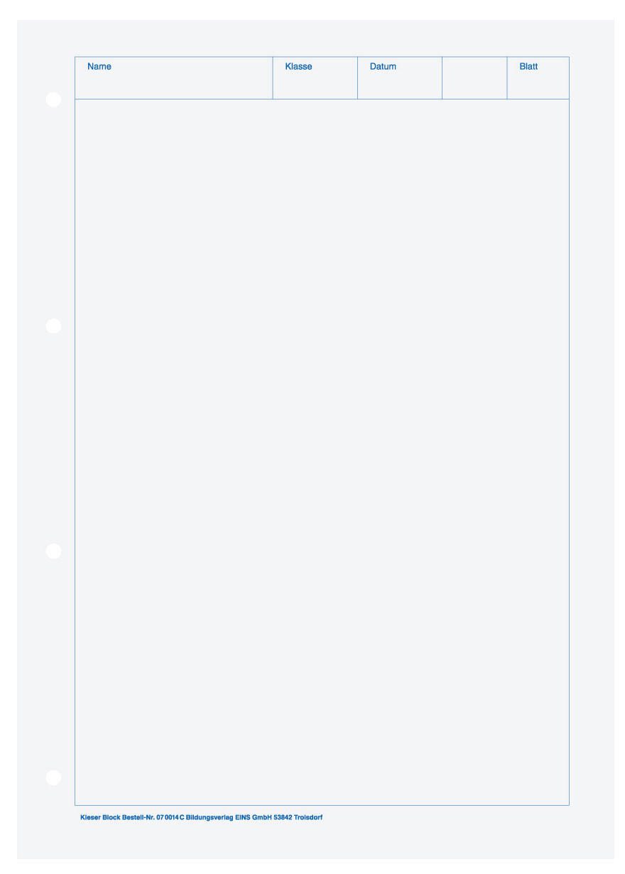 Mit einer praktischen 4-fach-Lochung kannst du die Arbeitsblöcke einfach in deinem Ordner abheften. Zusätzlich sorgt die Lochung dafür, dass deine Blätter immer geordnet bleiben. Die Nicht-Perforation der Blätter bietet Stabilität und verhindert ein versehentliches Herausreißen.