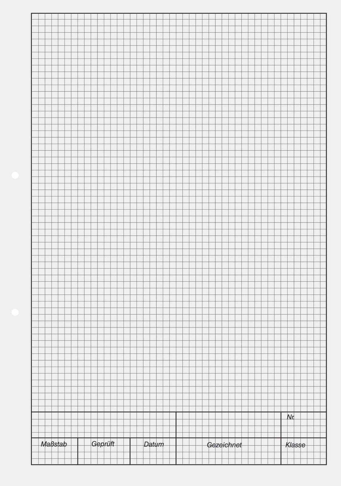 • Mit Fußzeile Maßstab, Geprüft, Datum, Gezeichnet und Klasse; Großes Schriftfeld