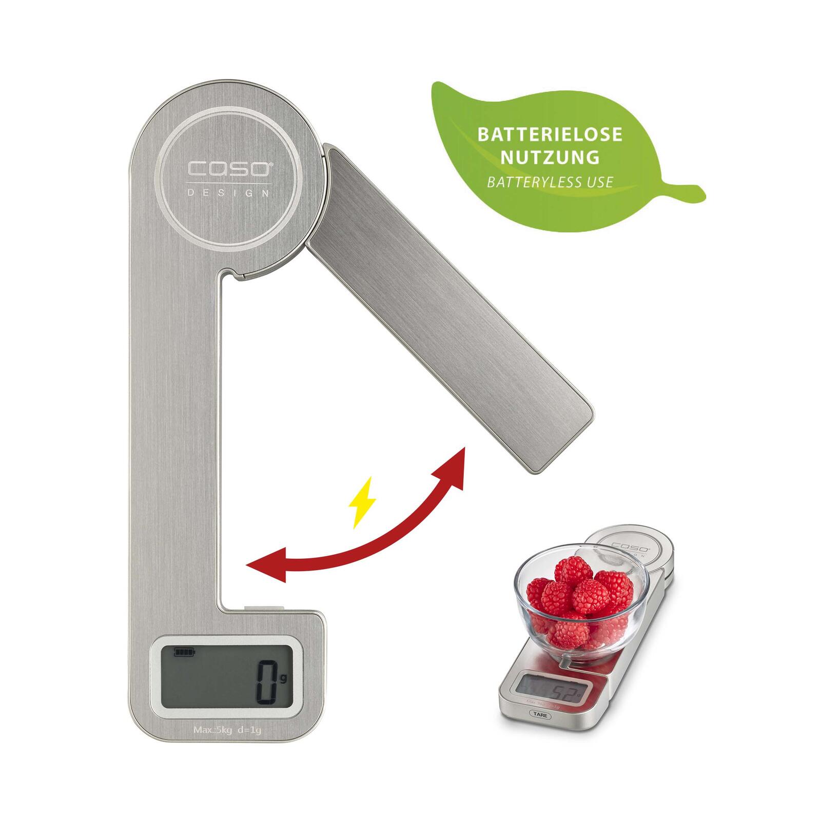 Du suchst nach einer praktischen Küchenwaage? Die Caso Küchenwaage KitchEcostyle ist die perfekte Wahl für deine Küche. Mit einer aufklappbaren Wiegefläche und einem digitalen Display bietet sie dir maximale Benutzerfreundlichkeit. Die Tarafunktion ermöglicht es dir, Zutaten nacheinander in derselben Schüssel zu wiegen, ohne zwischendurch umfüllen zu müssen. Ein besonderes Highlight dieser Waage ist die innovative Technologie, die es ermöglicht, kinetische Energie in elektrische Energie umzuwandeln. Bewege einfach den Waageschenkel, um für kurze Zeit Elektrizität zu erzeugen - nachhaltig und umweltfreundlich. Das Design der Caso Küchenwaage KitchEcostyle besticht durch seine flache und kompakte Bauweise. Je nach Größe deiner Schüssel kannst du die Waage geöffnet oder geschlossen nutzen, was sie besonders vielseitig macht. Hergestellt aus hochwertigem Edelstahl und in einem eleganten silbernen Farbton gehalten, fügt sich diese Waage perfekt in jede Kücheneinrichtung ein. Die Kitchen Ecostyle Serie von caso® bürgt für Qualität und Funktionalität. Mit einem Maßstab von 1,0 bietet diese Küchenwaage Präzision und Zuverlässigkeit bei jeder Wiegeaufgabe. Hol dir jetzt die Caso Küchenwaage KitchEcostyle und erleichtere dir das Kochen und Backen in deiner Küche.Technische Daten