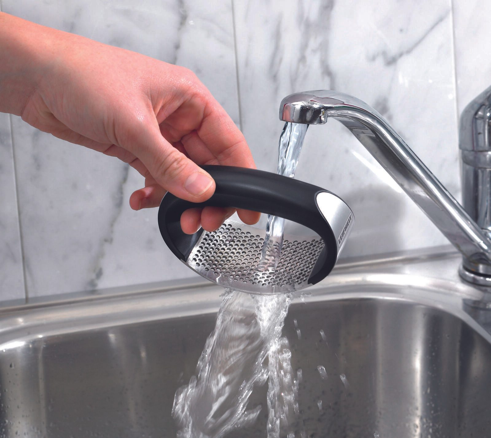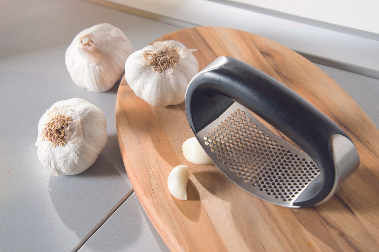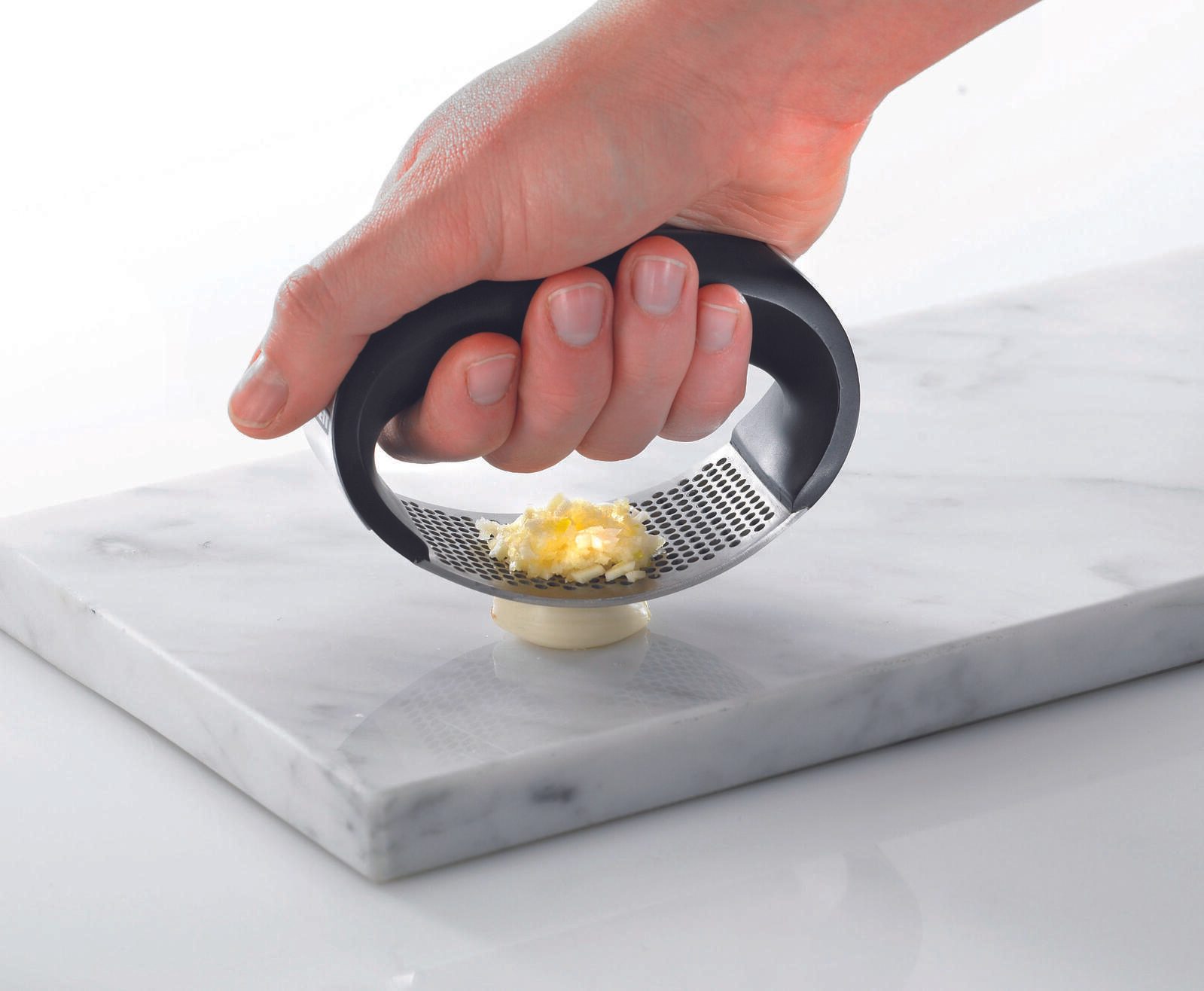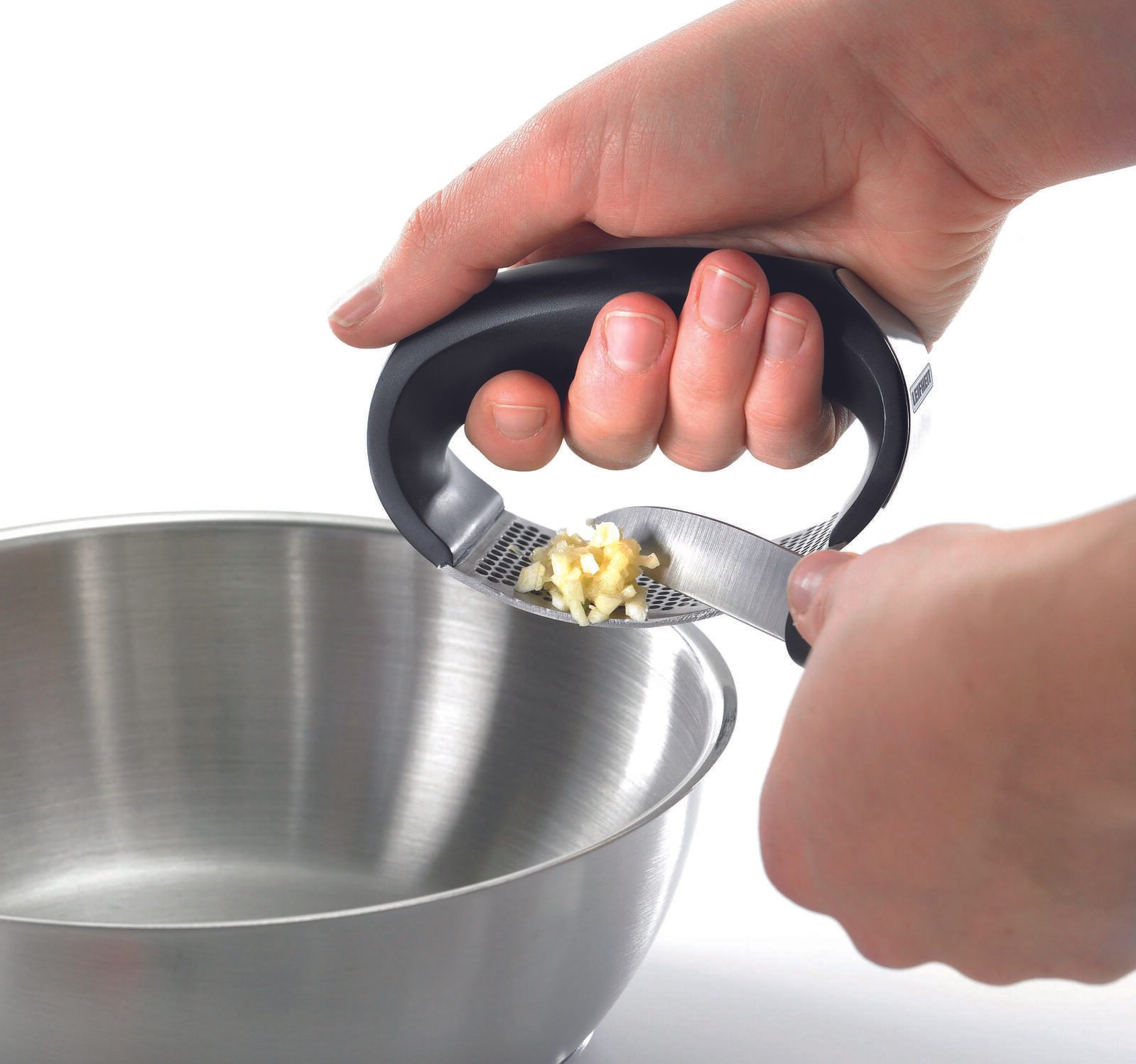 Mit der LEIFHEIT Knoblauchpresse Knobi King wird das Zerkleinern von Knoblauch zu einer mühelosen Aufgabe. Dank des Kunststoffgriffs liegt die Presse angenehm in der Hand und das robuste Edelstahlmaterial sorgt dafür, dass sie rostfrei und spülmaschinengeeignet ist.