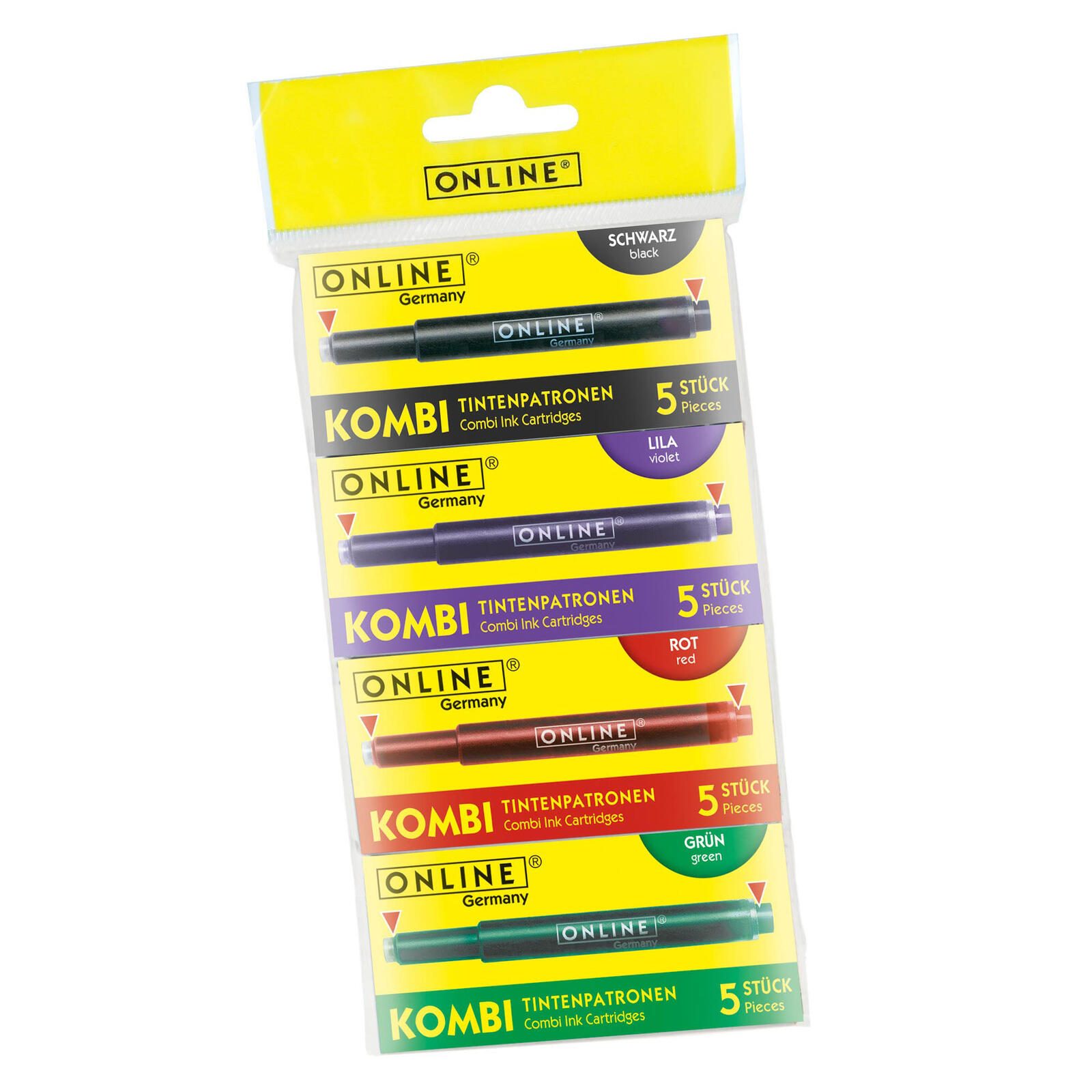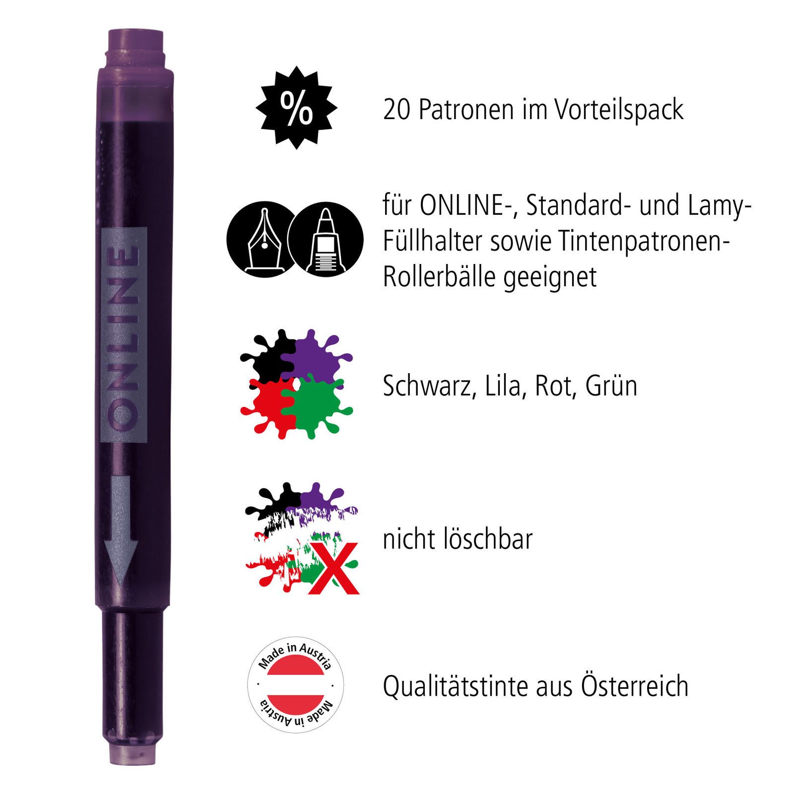 ONLINE® Tintenpatronen für Füller 5x lila, 5x grün, 5x schwarz, 5x rot