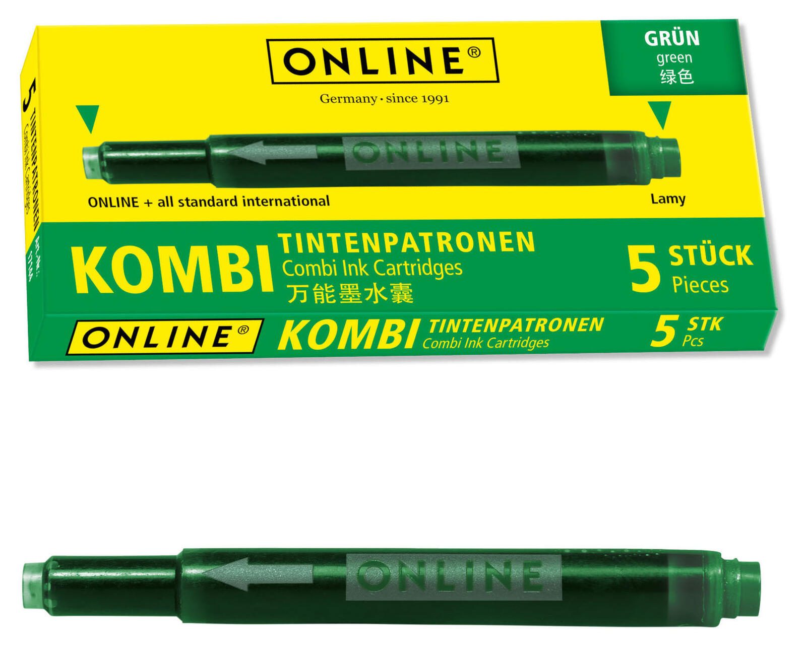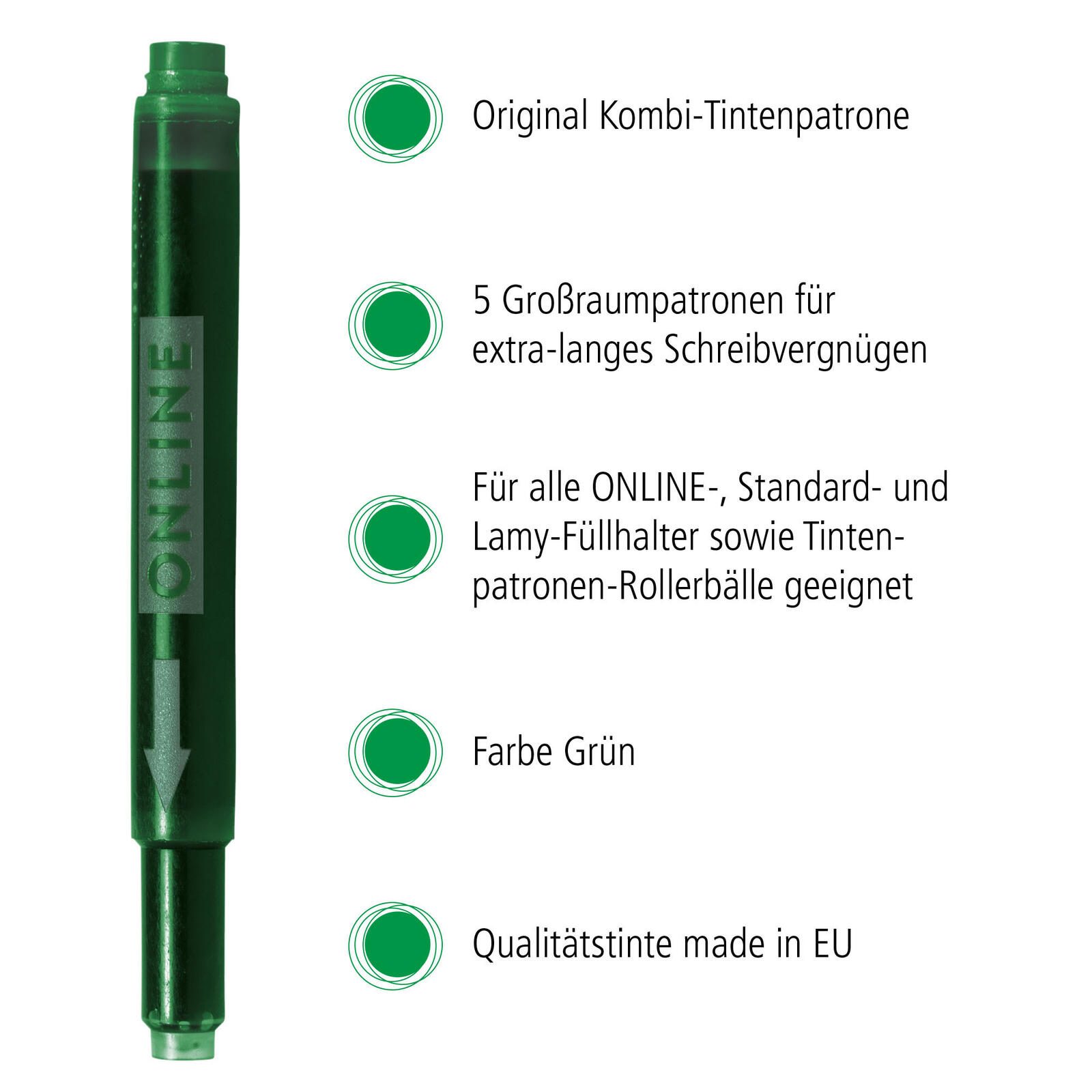 Die ONLINE® Tintenpatronen für Füller in der ansprechenden Farbe grün bieten eine hervorragende Lösung für alle, die Wert auf Qualität und Zuverlässigkeit legen. Diese praktischen Füllerpatronen sind ideal für den täglichen Gebrauch und passen sowohl in alle ONLINE als auch in Standard-Füller. Mit der dicken Seite sind sie speziell für Lamy Füller geeignet, was dir eine vielseitige Nutzung ermöglicht. In einer Packung erhältst du fünf hochwertige Tintenpatronen, die dir eine langanhaltende Schreibleistung bieten. Die grüne Tinte sorgt nicht nur für ein ansprechendes Schriftbild, sondern bringt auch Farbe in deine Notizen, Briefe oder Zeichnungen. Die einfache Handhabung der Patronen ermöglicht es dir, schnell und unkompliziert den Füller nachzufüllen, sodass du dich ganz auf das Schreiben konzentrieren kannst. Die ONLINE® Tintenpatronen zeichnen sich durch ihre hohe Farbbrillanz und eine gleichmäßige Tintenabgabe aus. Egal, ob du dünne oder dicke Linien ziehen möchtest, diese Patronen bieten dir die Flexibilität, die du benötigst. Die grüne Farbe ist perfekt geeignet, um wichtige Notizen hervorzuheben oder kreative Arbeiten zu gestalten. Mit den ONLINE® Tintenpatronen für Füller in grün entscheidest du dich für ein Produkt, das sowohl in der Schule als auch im Büro überzeugt. Die Kombination aus einfacher Handhabung, hoher Qualität und ansprechender Farbe macht diese Patronen zu einer idealen Wahl für alle, die Wert auf ein herausragendes Schreiberlebnis legen.Technische Daten