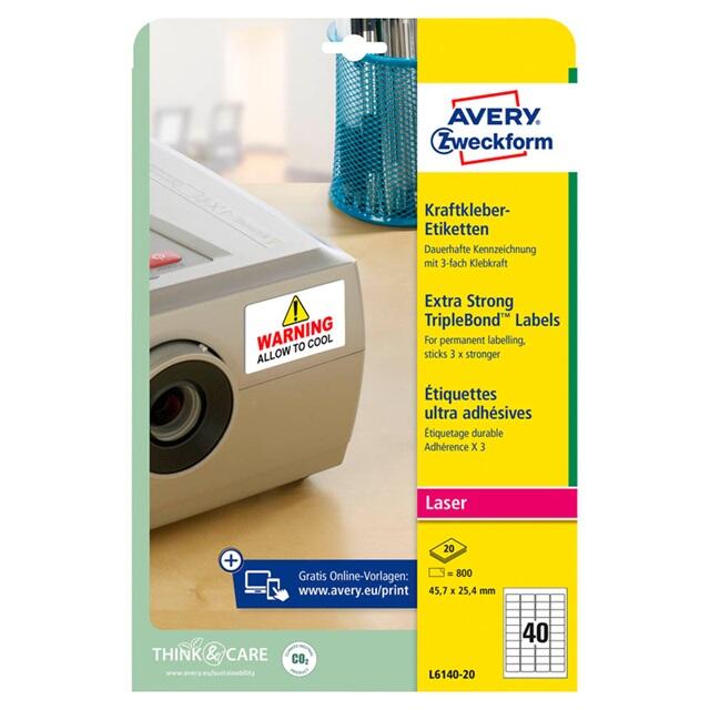 Die AVERY Zweckform Folien-Kraftklebe-Etiketten in der Größe 45,7 x 25,4 mm sind die ideale Lösung für alle, die zuverlässige und hochwertige Etikettierung benötigen. Mit einer Packung von 800 Etiketten, die auf 20 A4-Blättern angeordnet sind, bietet dieses Produkt eine hervorragende Kosteneffizienz und eine große Menge für diverse Anwendungen. Diese rechteckigen Etiketten bestehen aus robuster Polyester-Folie, die nicht nur wetterfest ist, sondern auch eine matte Oberfläche aufweist, die für eine ansprechende Optik sorgt. Die weiße Farbe ermöglicht es dir, deine Etiketten individuell zu gestalten und dabei eine klare Lesbarkeit zu gewährleisten. Dank der abgerundeten Ecken wird ein ansprechendes Design erreicht, das sich harmonisch in jede Umgebung einfügt. Die selbstklebenden Etiketten sind einfach zu handhaben und können sowohl mit Laserdruckern als auch mit Kopierern bedruckt werden, was dir Flexibilität bei der Erstellung deiner Etiketten bietet. Diese Kraftklebe-Etiketten haften zuverlässig und sind ideal für Anwendungen, bei denen eine dauerhafte Beschriftung gewünscht ist. Ob für das Etikettieren von Produkten, das Organisieren von Unterlagen oder das Beschriften von Regalen, die AVERY Zweckform Folien-Kraftklebe-Etiketten sind vielseitig einsetzbar. Ihre temperaturbeständigen Eigenschaften machen sie zudem zu einer ausgezeichneten Wahl für verschiedene Umgebungen. Mit diesen Etiketten kannst du sicher sein, dass deine Beschriftungen stets gut lesbar und professionell aussehen.Technische Daten