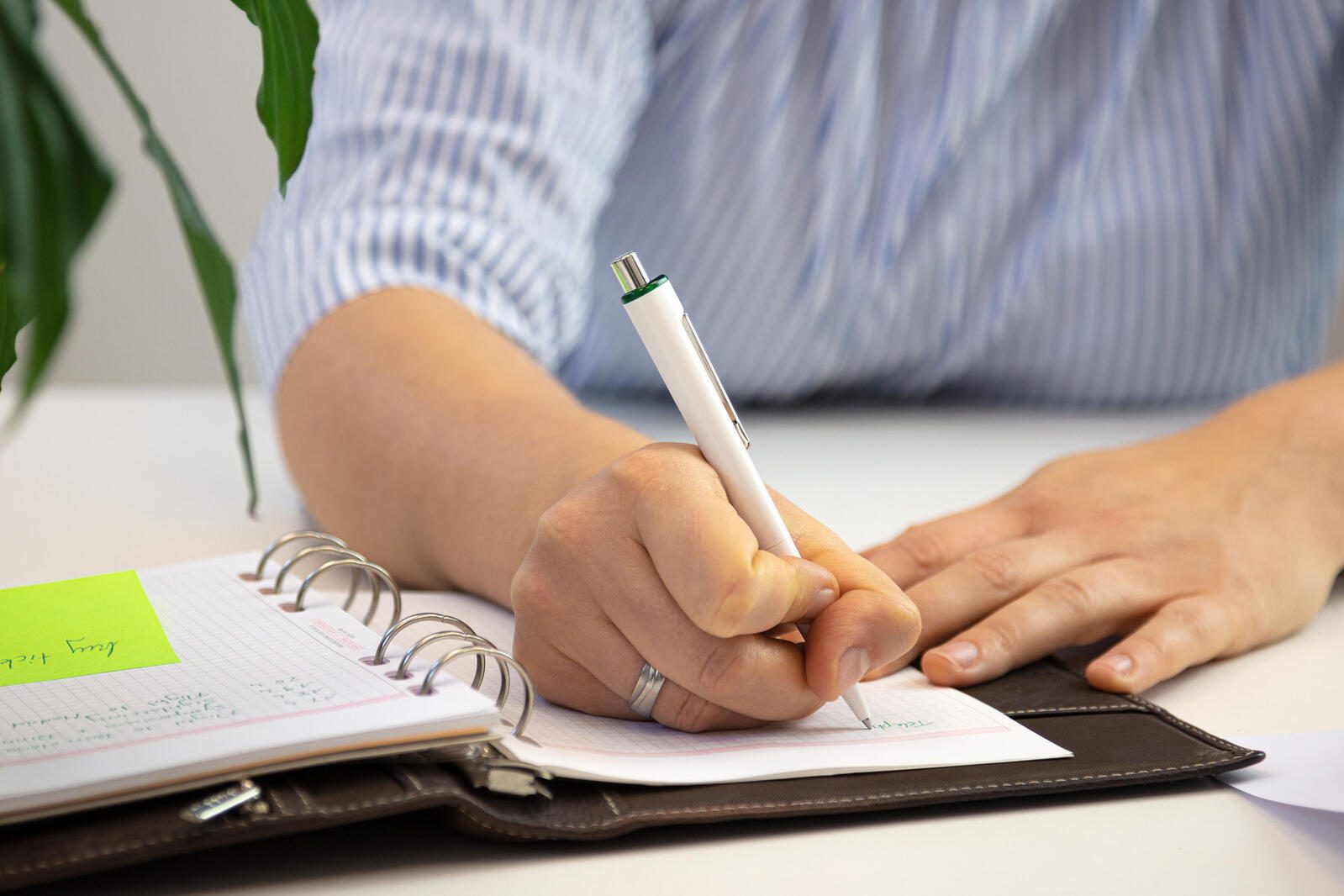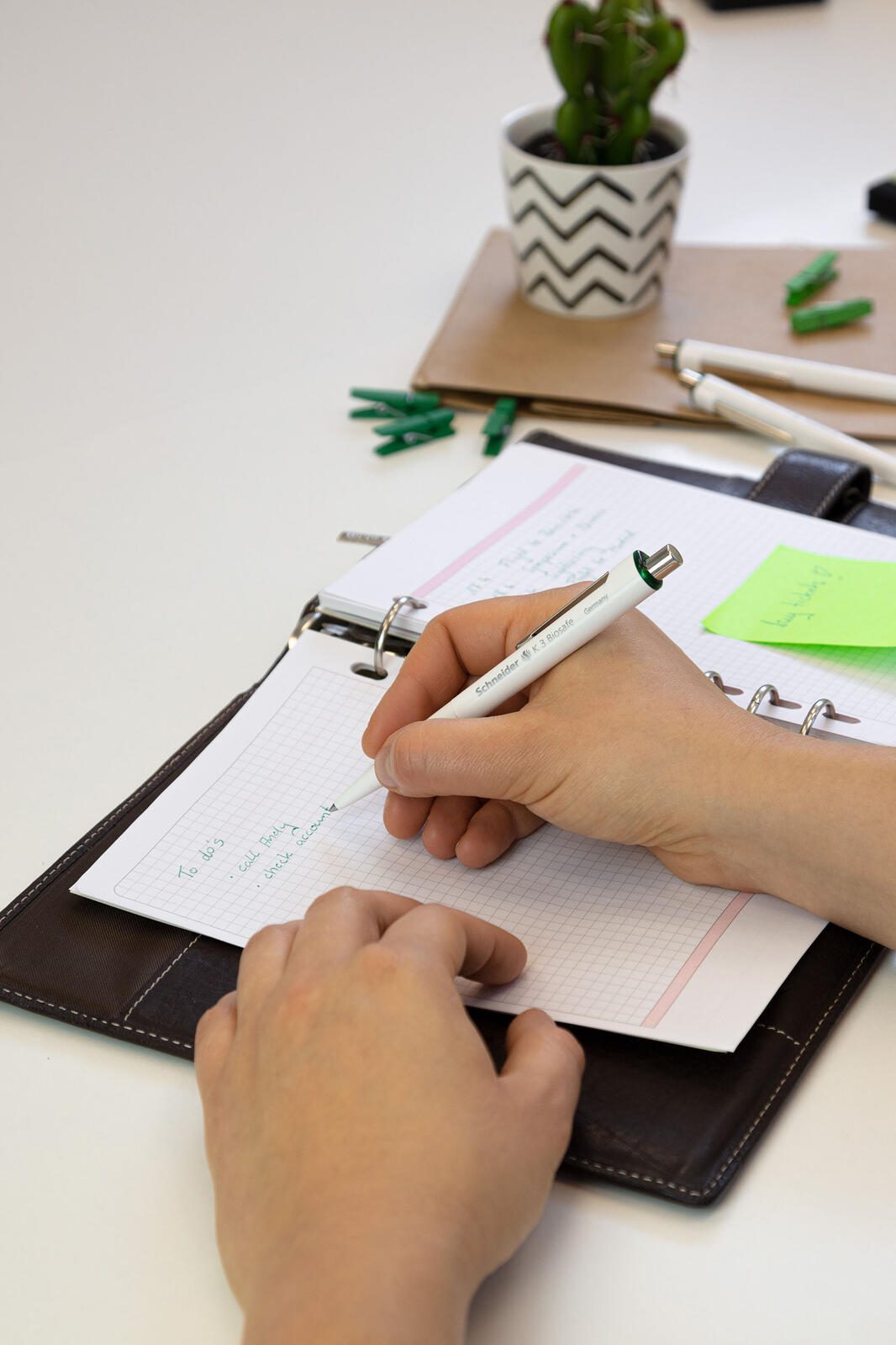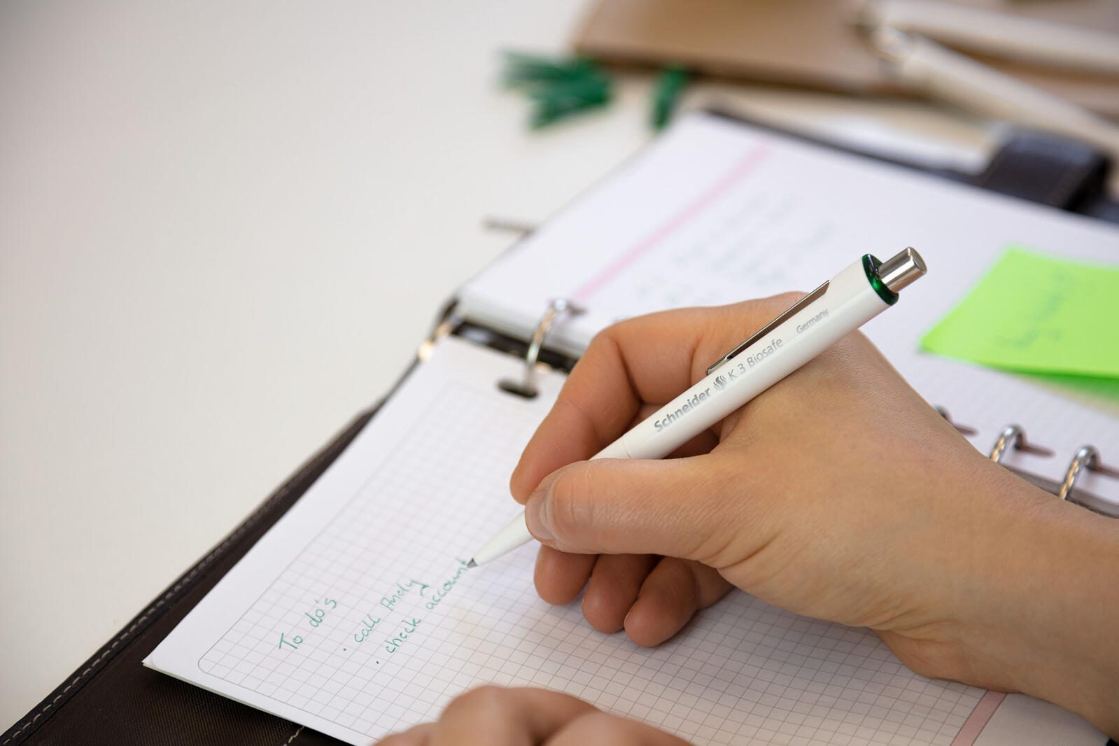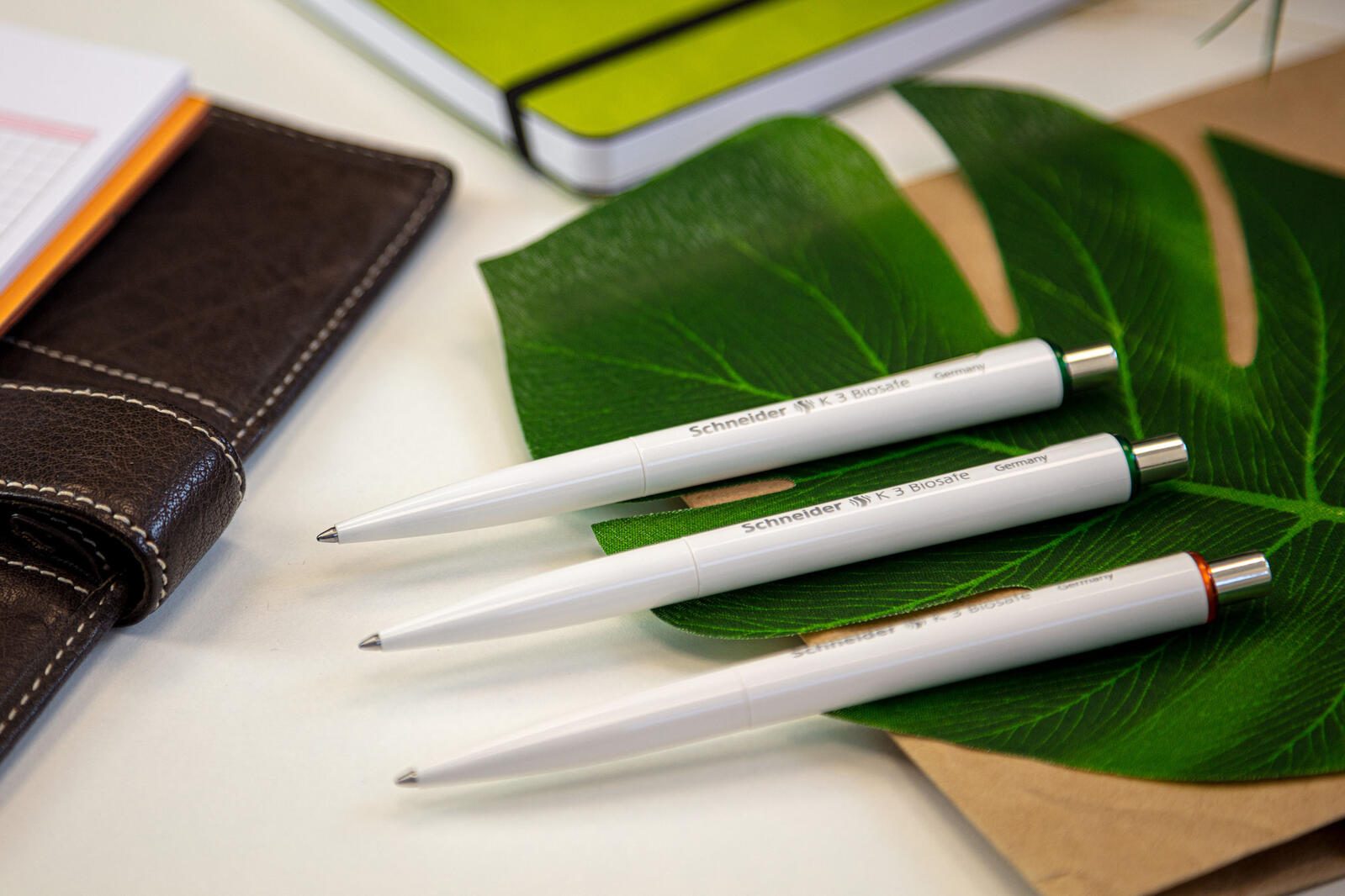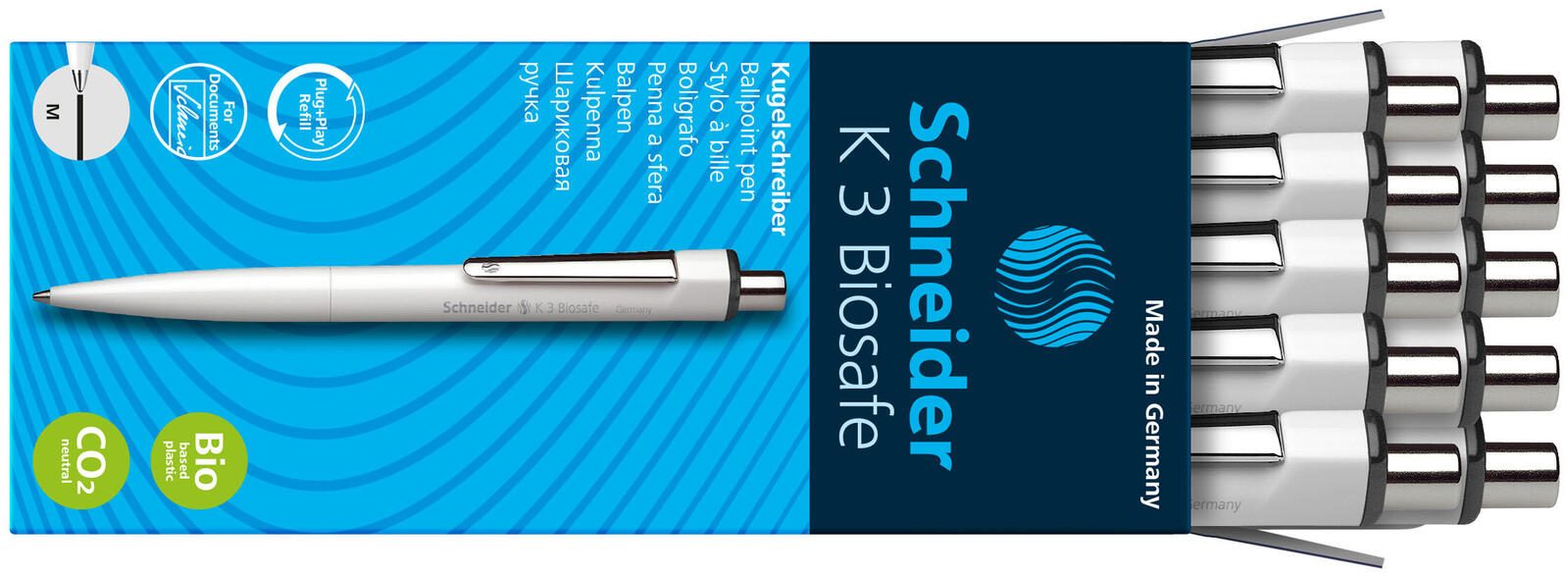 Der Schneider K3 Biosafe Kugelschreiber vereint umweltfreundliches Design mit hervorragender Schreibqualität. Mit einer Strichstärke von 0.6 mm und der klassischen Schreibfarbe Schwarz ist dieser Druckkugelschreiber ideal für alle, die Wert auf präzises und sauberes Schreiben legen. Das Gehäuse des Kugelschreibers besteht zu 65 % aus biobasiertem Kunststoff und ist somit eine nachhaltige Wahl für umweltbewusste Nutzer. Zudem ist der Kugelschreiber CO2-neutral, was ihn zu einer verantwortungsbewussten Option in deinem Schreibwarenarsenal macht. Der K3 Biosafe Kugelschreiber ist nicht nur umweltfreundlich, sondern auch äußerst praktisch. Er verfügt über einen stabilen Clip, der ein einfaches Befestigen an Notizblöcken oder Taschen ermöglicht. Darüber hinaus ist der Kugelschreiber nachfüllbar, was bedeutet, dass du ihn über einen langen Zeitraum hinweg nutzen kannst, ohne ständig neue Schreibgeräte kaufen zu müssen. Die enthaltenen Minen sind die Schneider Express 735, Schneider Express 775, Schneider Slider 755 und Schneider Gelion 39, die für ein gleichmäßiges und flüssiges Schreibgefühl sorgen. Mit seinem eleganten weißen Gehäuse und dem runden Griff liegt der Schneider K3 Biosafe Kugelschreiber angenehm in der Hand. Er eignet sich hervorragend für den täglichen Gebrauch in Schule, Büro oder zu Hause. Ob beim Schreiben von Notizen, beim Zeichnen oder beim Unterzeichnen wichtiger Dokumente – dieser Kugelschreiber bietet stets eine zuverlässige Leistung. Die Kombination aus Funktionalität, Nachhaltigkeit und ansprechendem Design macht den Schneider K3 Biosafe Kugelschreiber zu einer ausgezeichneten Wahl für jeden, der nicht nur auf Qualität, sondern auch auf Umweltbewusstsein Wert legt. In einer Packung erhältst du gleich 10 Stück, sodass du immer einen Vorrat zur Hand hast.Technische Daten