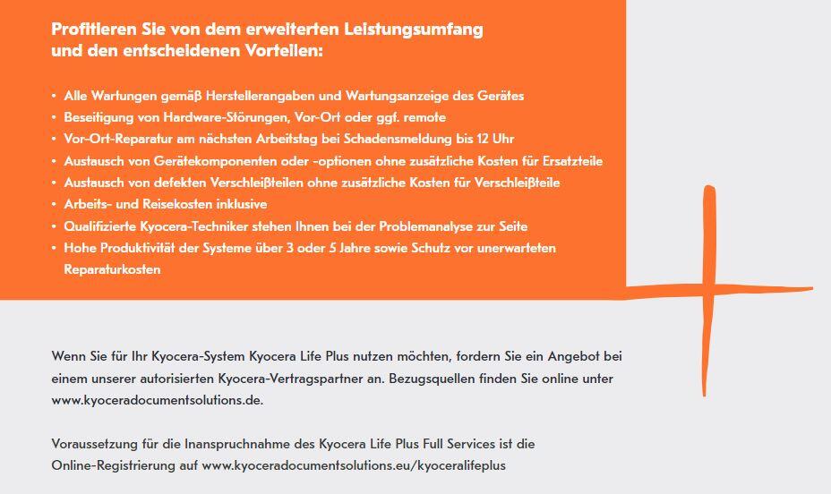 ![]() Alle ECOSYS-Drucker und -Multifunktionssysteme sind mindestens mit einer umfassenden 2-Jahres-Garantie ausgestattet. Und diese können Sie auf Wunsch noch erweitern – mit Kyocera Life. Profitieren Sie von der Sicherheit konkurrenzlos niedriger Betriebskosten – ohne dass eventuelle Reparaturen Sie böse überraschen. Genießen Sie zudem ein Maximum an Investitions-sicherheit. |
