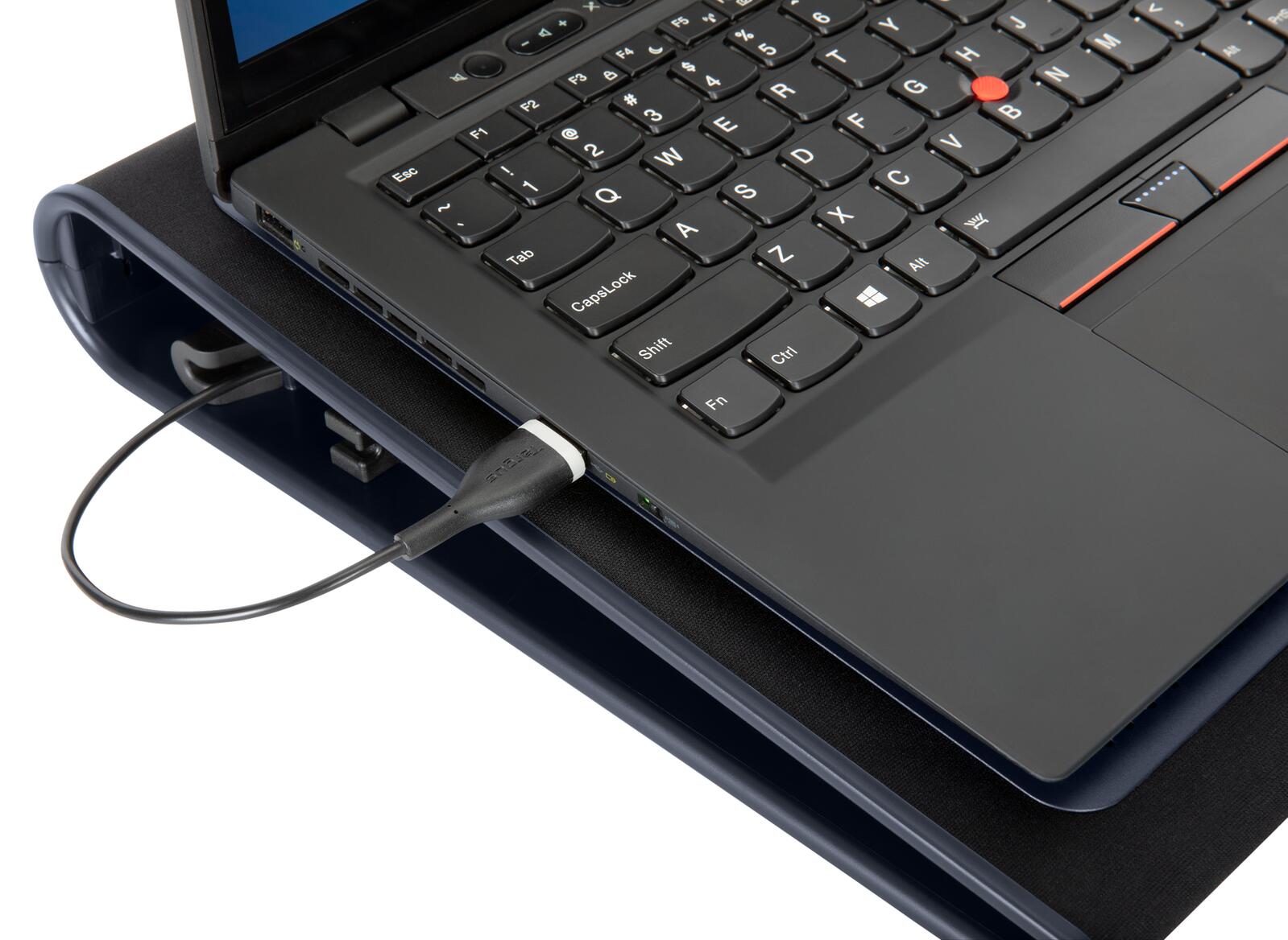 Der Notebook-Kühlsockel von Targus bietet eine komfortable und ergonomische Arbeitsfläche, die zudem noch dafür sorgt, dass weder Sie noch Ihr Notebook sich überhitzen. Der Kühlsockel liegt auf Ihrem Schoß und verteilt die vom Notebook erzeugte Wärme mit Hilfe von zwei Lüftern. Dieser Luftstrom wird behindert, wenn das Notebook auf einem Kissen oder einer Bettdecke verwendet wird. Stecken Sie einfachen den USB-Stecker in einen Anschluss ein, um die Kühlung zu aktivieren. Dank der ergonomischen Neigung müssen beim Tippen keine Abstriche gemacht werden, und das weiche Neopren-Material sorgt für gepolsterten Komfort auf Ihrem Schoß. Dank der offenen Konstruktion können die Lüfter ruhig laufen und für einen konstanten Luftstrom sorgen. Vier Gummifüße an der Oberseite des Kühlsockels verhindern, dass das Notebook wegrutscht. Die angewinkelte Gestaltung in Kombination mit der Ausführung aus weichem Neopren sichert maximalen Komfort auch bei längeren Einsatzzeiten, damit Sie nie die Lust an Ihrem Notebook verlieren.