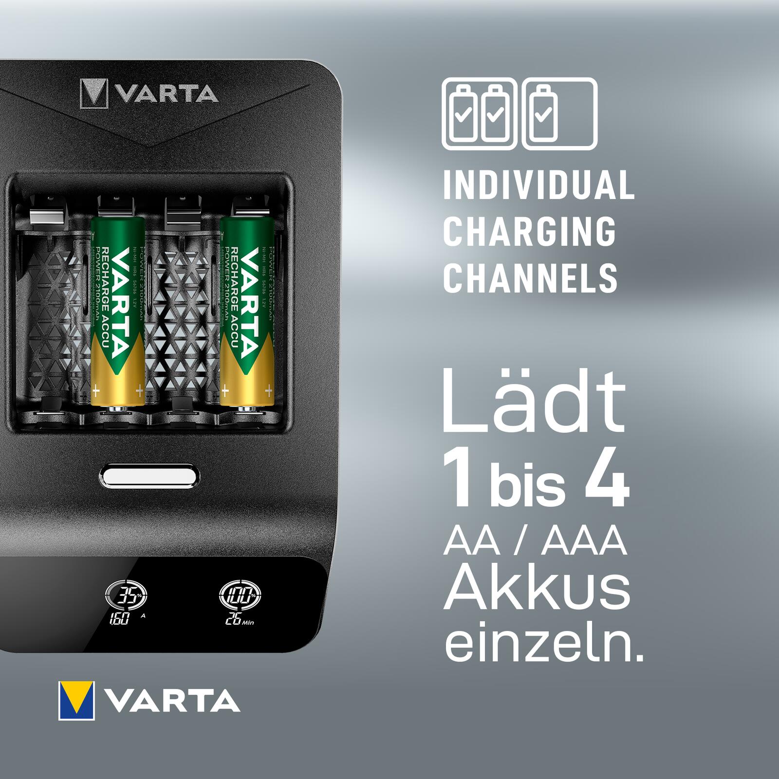 - Premium-Ladegerät in eleganter schwarzer Farbe mit LCD-Displays zur Anzeige des Ladestands. Einzigartige VARTA-Markenelemente sorgen für einen außergewöhnlichen Produktlook