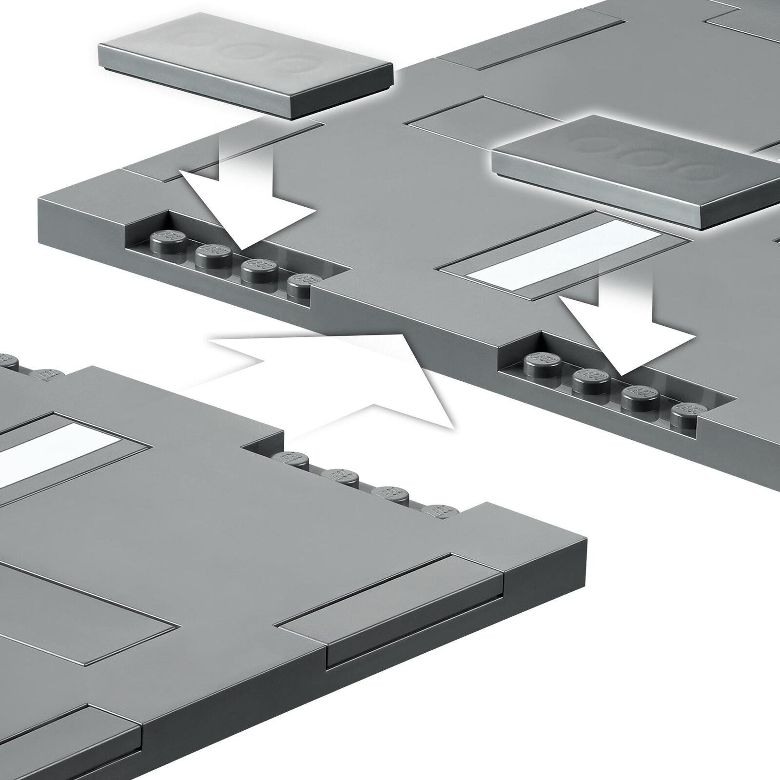 Inhalt des Sets: 5 LEGO® Straßenplatten mit Fahrbahnmarkierungen, Bremsschwellen und ein Zebrastreifen sowie Straßenlampen, die im Dunkeln leuchten. Ampeln, Straßenschilder und Begrünungselemente komplettieren das Set.
