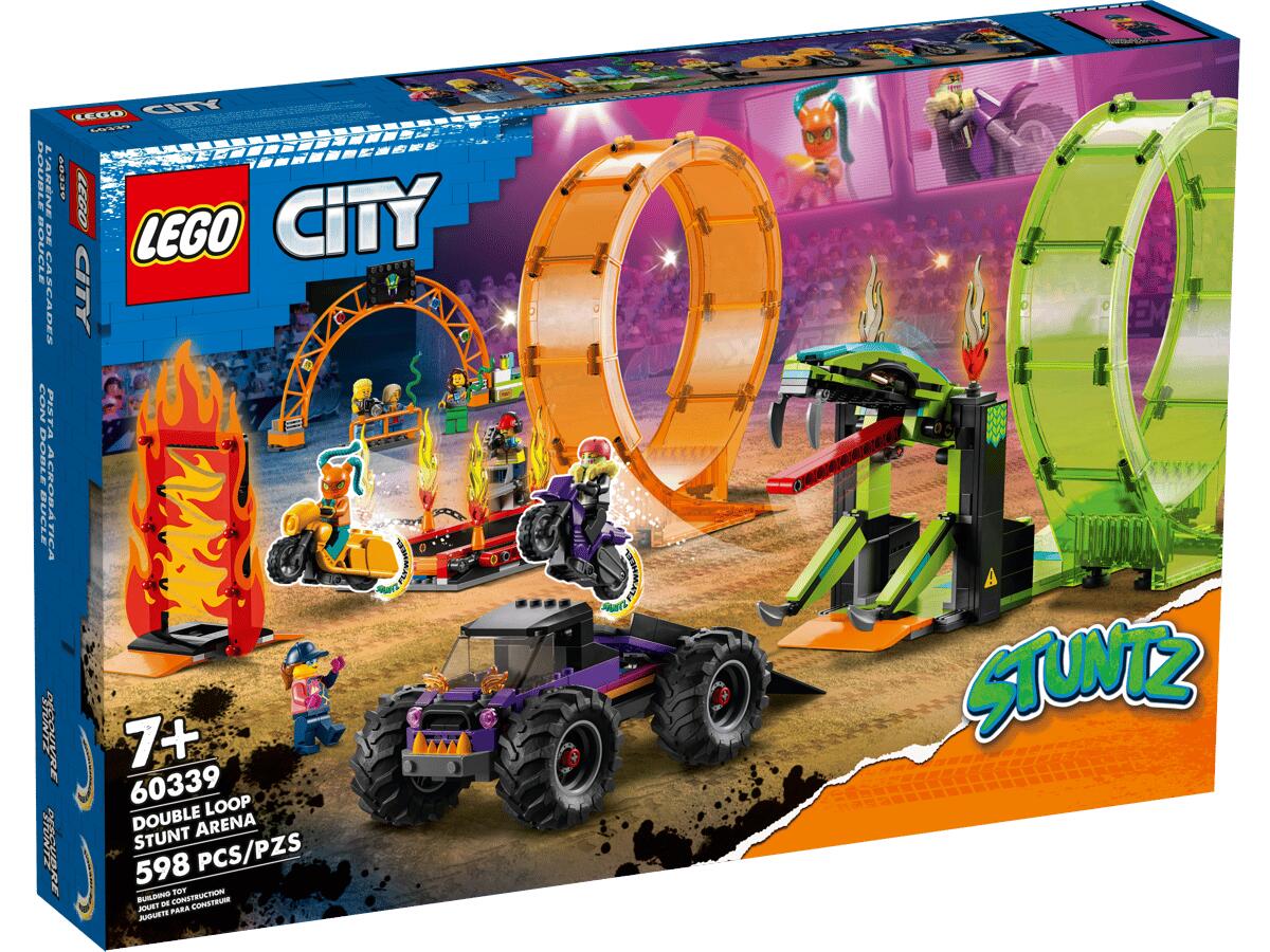 Das LEGO® City Spielset „Stuntshow-Doppellooping“ (60339) beinhaltet jede Menge Funktionen, 2 Stuntbikes mit Schwungrad sowie einen Monstertruck mit Rampe für echte Stunts. In der Stuntshow-Arena befinden sich eine Feuerwand, ein Schlangenlooping mit zuschnappendem Schlangenmaul, ein Feuerlooping und reichlich cooles Zubehör. 7 Minifiguren, darunter auch 2 Stuntbike-Fahrer, laden zu spannenden Shows und Wettbewerben ein.