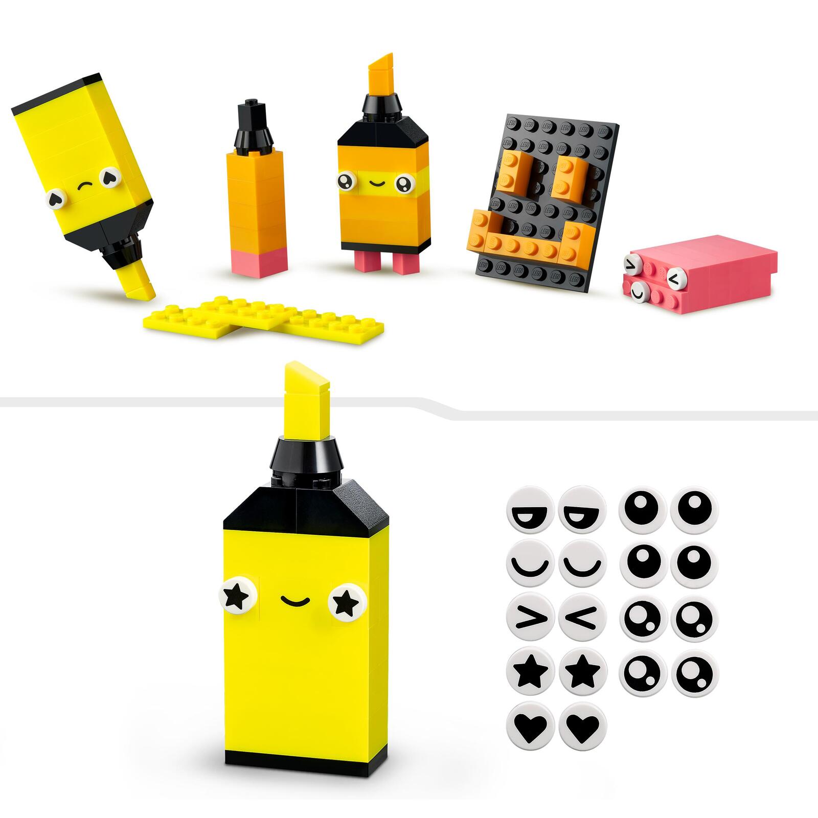 Dieses vielseitige Bauset beinhaltet 333 Steine in unterschiedlichen Größen und lebhaften Neonfarben. 18 Steine mit ausdrucksstarken Augen erwecken die eigenen Kreationen zum Leben. Gedruckte Bauanleitungen für 5 Modelle – Ananas, Textmarker, Auto, Alien und Rollschuhe – geben deinem Kind das nötige Selbstvertrauen, um alles zu bauen, was ihm in den Sinn kommt! Und in der LEGO Builder App sind auch digitale Versionen der Bauanleitungen zu diesem Set verfügbar.