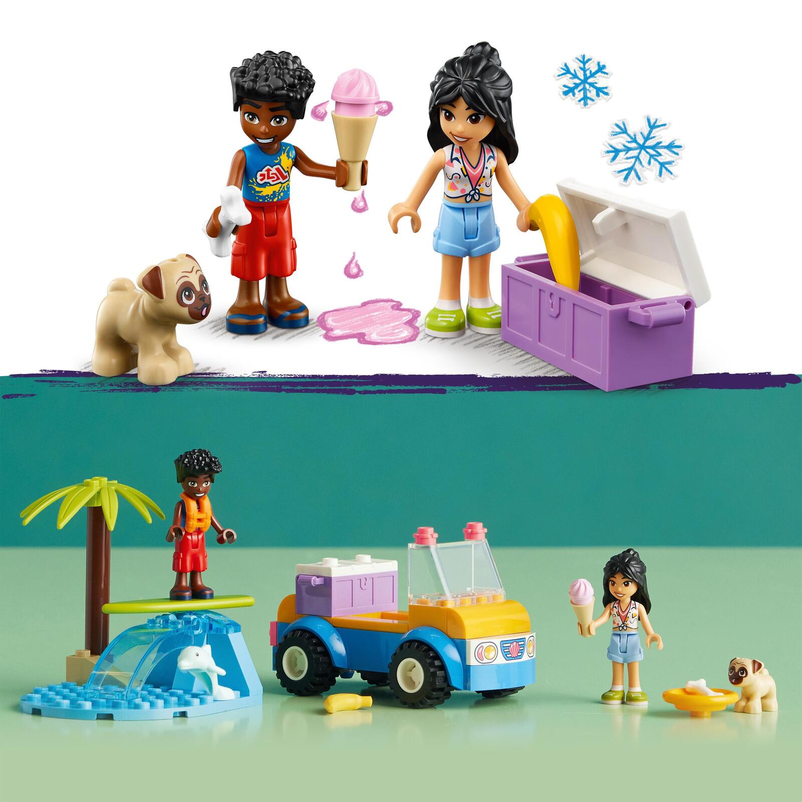 2 Spielfiguren und Zubehör: Das Set beinhaltet die LEGO® Friends Figuren Liann und Zac, einen Mops, einen Delfin, eine Welle, einen Strandbuggy und eine Kühlbox
