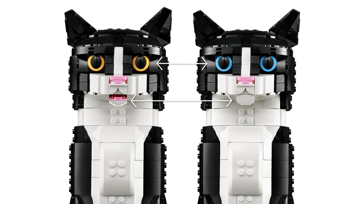 Ebenso faszinierendes wie kreatives Bauprojekt: Wähle gelbe oder blaue Augen aus und baue die Katze mit offenem oder geschlossenem Maul