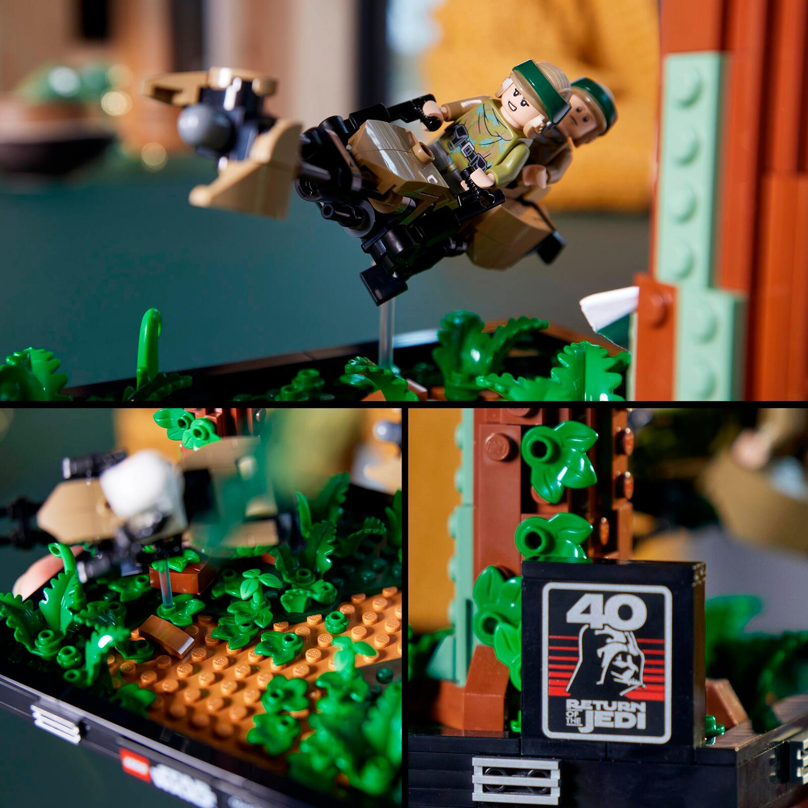 Verfolgungsjagd auf Endor™ – Diorama (75353): Bilde eine ebenso detailgetreue wie dynamische Szene aus LEGO® Steinen nach, die die legendäre Speeder-Verfolgungsjagd auf dem Waldmond von Endor aus Star Wars: Die Rückkehr der Jedi-Ritter darstellt