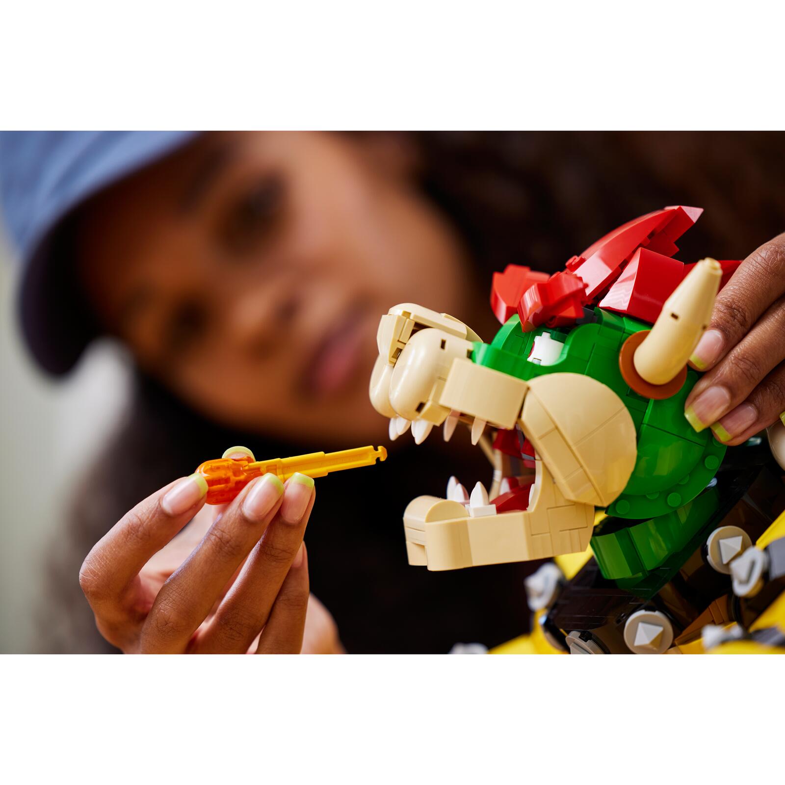 Das LEGO® Super Mario™ Set „Der mächtige Bowser“ (71411) zum Bauen, Spielen und Ausstellen lässt dich den König der Koopas würdigen. Diese Figur wird unter anderem aus LEGO Elementen gebaut, die im Oktober 2022 neu herauskommen, um Bowsers Stacheln exakt nachzubilden. Zu dem Modell gehören auch ein Feuerball-Shooter und ein Knopf zur Steuerung der Kopf- und Halsbewegungen. Seine Arme und Finger sind ebenfalls beweglich!