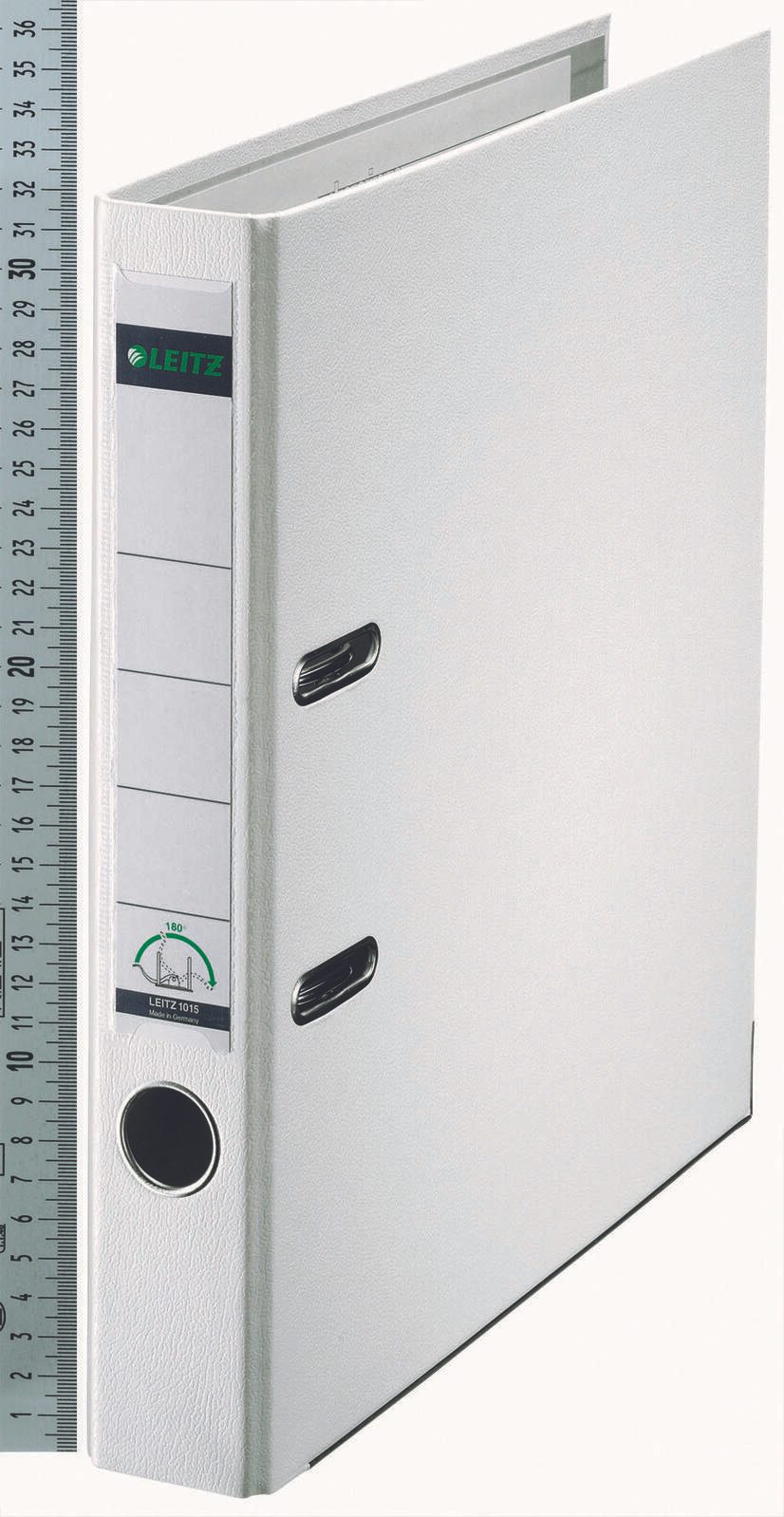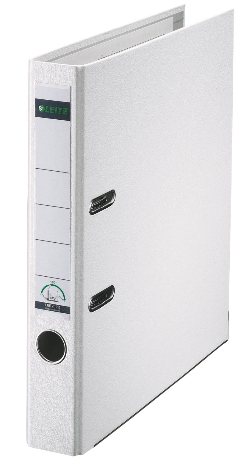 Der LEITZ Ordner mit einer Rückenbreite von 5.2 cm ist die ideale Lösung für die ordentliche Aufbewahrung und Organisation deiner Dokumente im DIN A4 Format. Hergestellt aus hochwertigem Kunststoff, bietet er nicht nur eine ansprechende Optik in elegantem Weiß, sondern auch eine hohe Langlebigkeit und Robustheit. Das genarbte Oberflächenmaterial verleiht dem Ordner eine ansprechende Haptik und schützt ihn vor Kratzern und Abnutzung. Ein besonderes Merkmal dieses Ordners ist das einsteckbare Rückenschild, das dir ermöglicht, die Inhalte jederzeit klar zu kennzeichnen und schnell zu identifizieren. Mit der praktischen 180°-Hebelmechanik kannst du deine Dokumente mühelos entnehmen und wieder ablegen, was die Handhabung erheblich erleichtert. Zudem verfügt der Ordner über einen Griffloch, sodass du ihn bequem aus Regalen entnehmen kannst. Die integrierten Raumsparschlitze sorgen dafür, dass der Ordner auch bei vollem Inhalt platzsparend bleibt und sich perfekt in deine Büroumgebung einfügt. Der Kantenschutz erhöht die Stabilität und schützt die Ecken vor Beschädigungen, was besonders wichtig ist, wenn der Ordner häufig genutzt wird. Ob im Büro, in der Schule oder zu Hause – der LEITZ PP-Ordner ist ein unverzichtbares Hilfsmittel zur strukturierten Ablage von Unterlagen. Mit seinem schlichten, weißen Design fügt er sich harmonisch in jede Umgebung ein und bietet dir die Möglichkeit, deine Dokumente sicher und stilvoll zu archivieren.Technische Daten