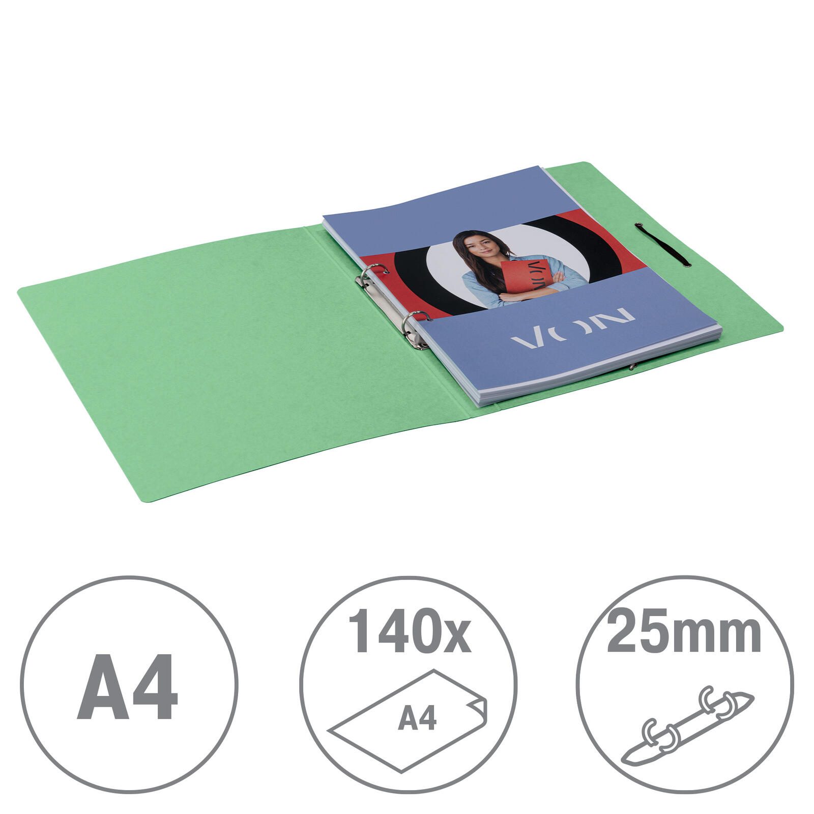 Das Ringbuch besteht aus robustem Karton, der außen und innen mit einer hochwertigen Oberfläche versehen ist. Die Abheftmechanik verfügt über zwei Ringe, die das sichere Halten der Blätter gewährleisten und ein einfaches Ein- und Ausheften ermöglichen. Ein Rückenschild ist vorhanden, um das Ringbuch individuell zu beschriften und schnell zu identifizieren.