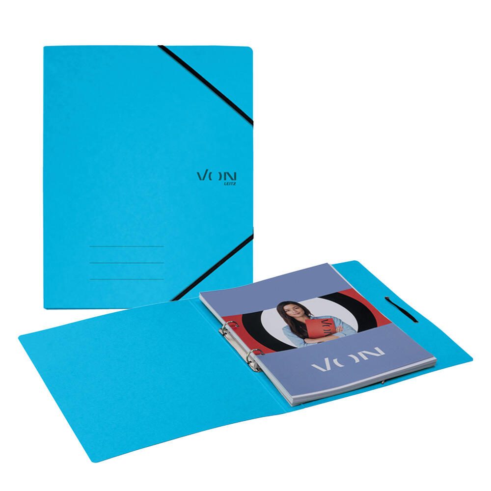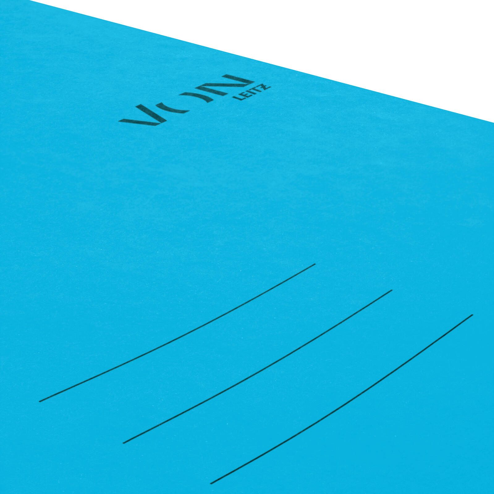 Das Ringbuch ist in einem hellblauen Farbton gehalten und besteht aus robustem Karton, der dem Produkt eine stabile und widerstandsfähige Oberfläche verleiht. Innen und außen ist das Material entsprechend verarbeitet, um eine angenehme Haptik und Langlebigkeit sicherzustellen. Trotz seiner kompakten Form bietet das Ringbuch ein Füllvermögen von bis zu 140 Blatt, was ausreichend Platz für umfangreiche Unterlagen bietet.