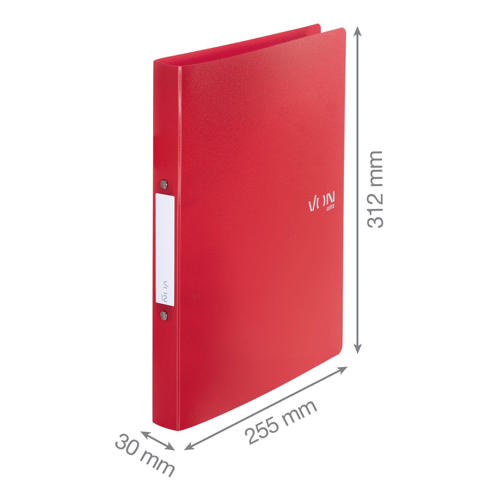 Gefertigt aus robustem Kunststoff, zeichnen sich die Ringbücher durch ihre Langlebigkeit und Widerstandsfähigkeit aus. Die 2-Ring-Mechanik sorgt für eine sichere Befestigung der Dokumente und erleichtert das Ein- und Ausheften. Auf der Rückseite sowie am Titel lassen sich Einlegeformate von 25,5 x 31,2 cm verwenden, am Rücken ist ein Einlegeformat von 3,0 x 31,2 cm vorgesehen, um Beschriftungen übersichtlich zu gestalten.