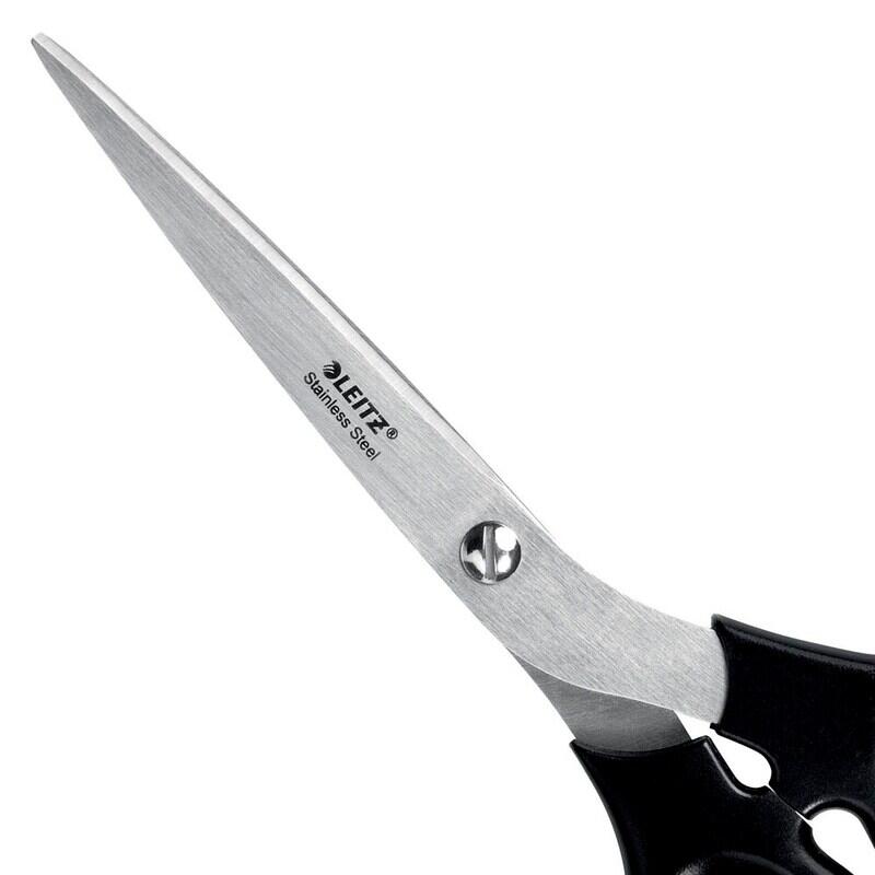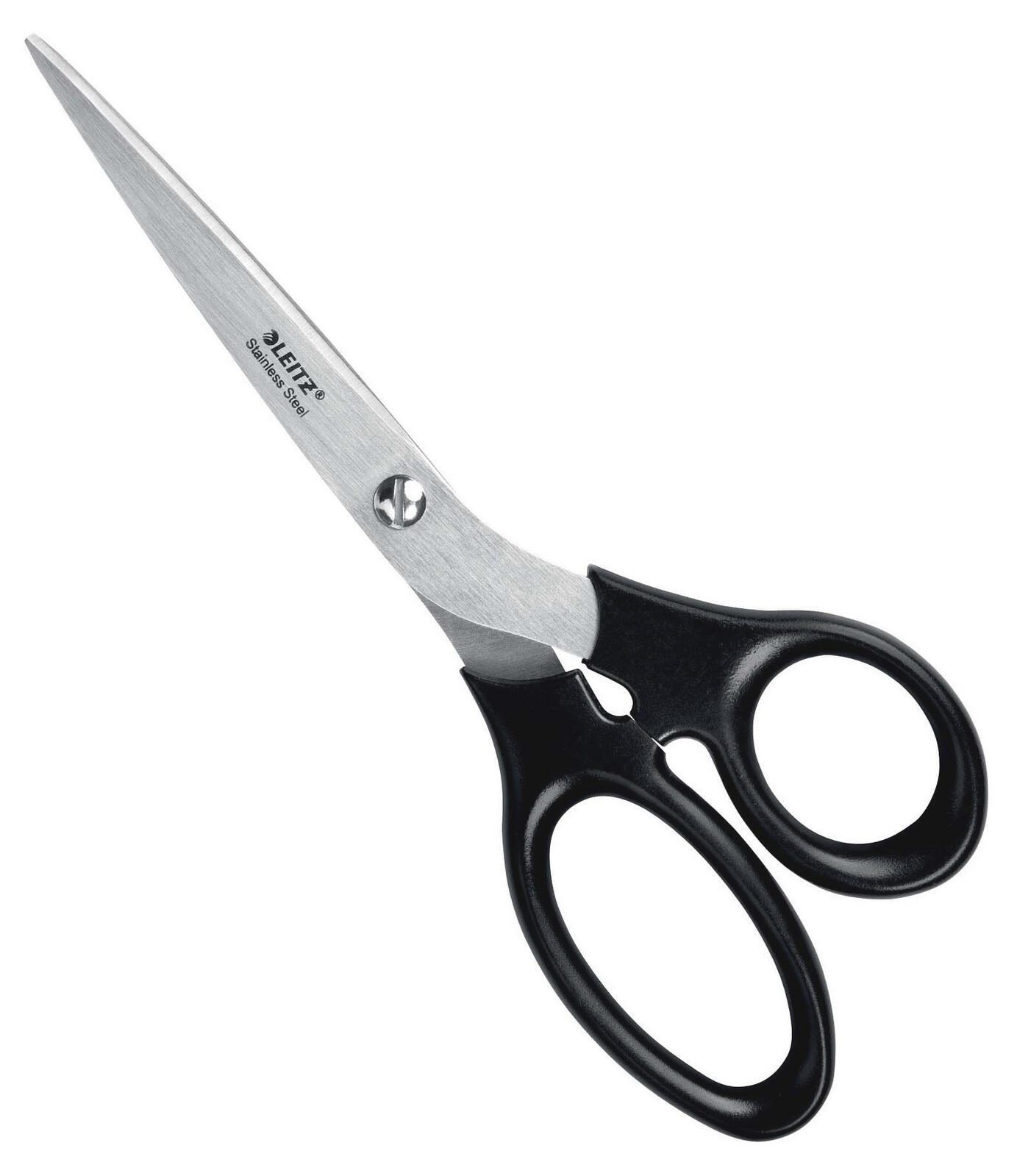 Die LEITZ Schere in schwarzer Ausführung hat eine Länge von 20,0 cm und eignet sich besonders zum Schneiden von Papier. Sie ist als Büroschere konzipiert und bietet eine spitze Form, die präzises Arbeiten ermöglicht. Die Klinge besteht aus robustem Edelstahl, was für eine lange Haltbarkeit und scharfe Schnitte sorgt.