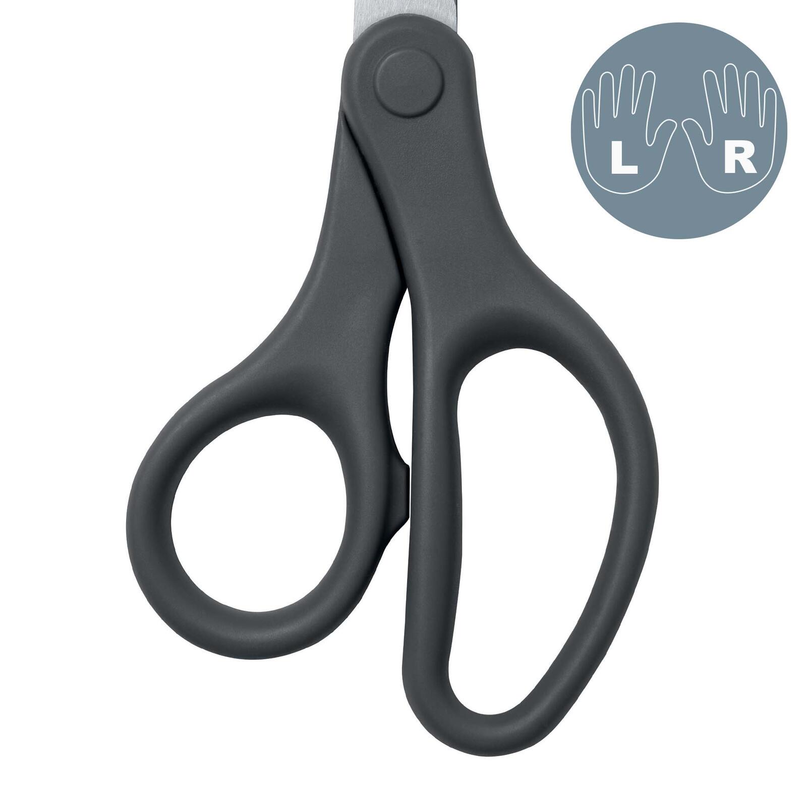 Die LEITZ Schere Titanium in dunkelgrau ist eine Büroschere mit einer Länge von 20,5 cm. Sie ist speziell für den Zuschnitt von Papier konzipiert und eignet sich sowohl für Rechts- als auch für Linkshänder. Die spitze Form der Klingen ermöglicht präzises Schneiden, was sie zu einem praktischen Werkzeug im Büroalltag macht.