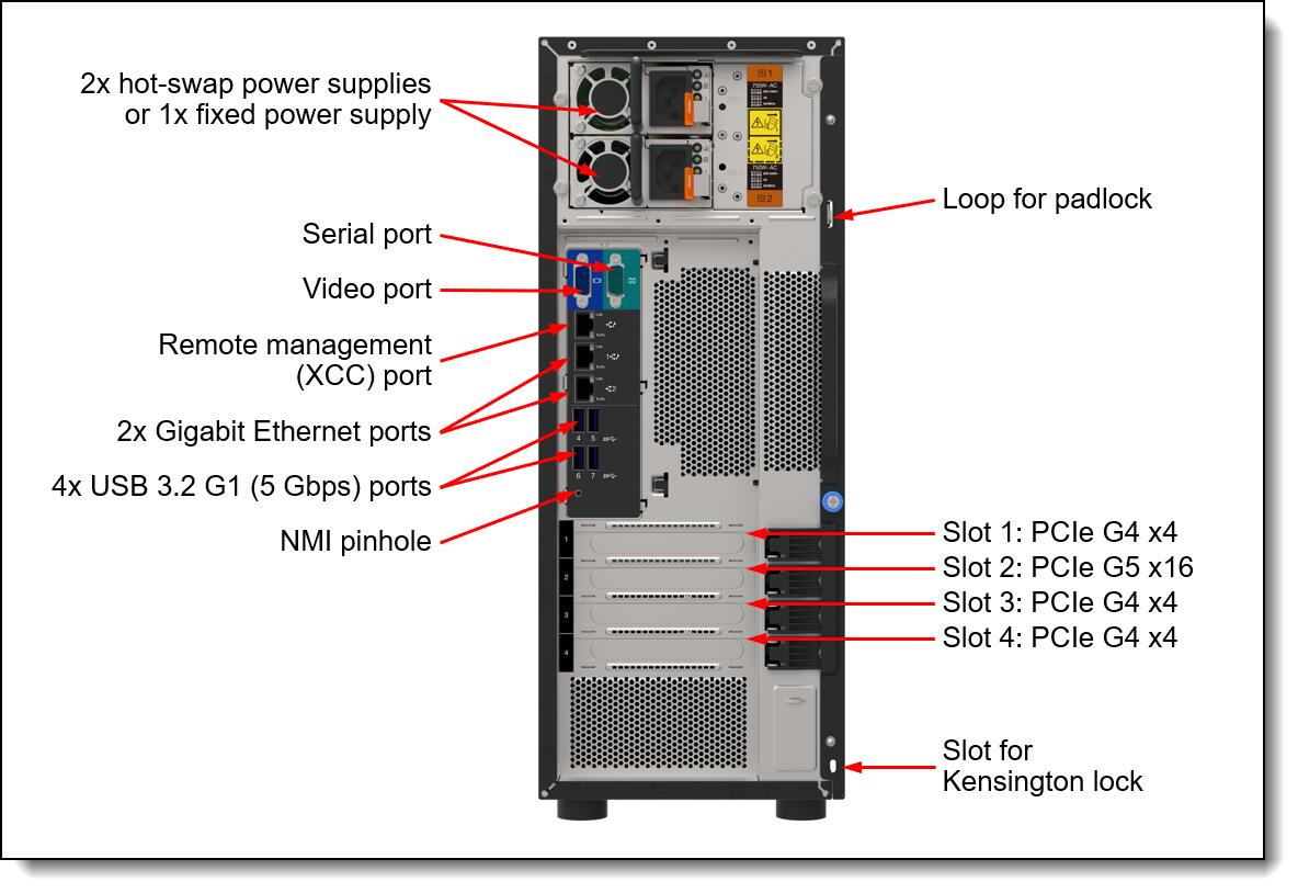 - Physische Sicherheitsmaßnahmen, um unbefugten Zugriff zu verhindern: Schlaufen für Vorhängeschlösser zum Verhindern des Öffnens der Seitenwand und ein Schlitz auf der Rückseite des Servers für ein Kensington Cable Lock. Zusätzliche optionale physische Sicherheitsfunktionen sind eine abschließbare Fronttür und ein Gehäuse-Einbruchschalter (bei einigen Modellen enthalten