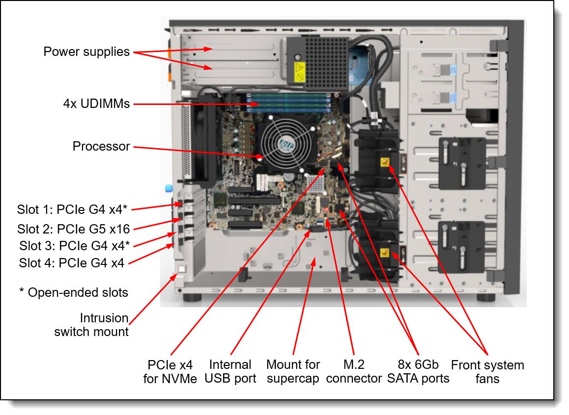 - Der ST250 V3 unterstützt UDIMM-Speicher mit ECC-Schutz, der Fehlerkorrektur bietet, die bei PC-klassigen „Servern“, die Paritätsspeicher verwenden, nicht verfügbar ist. Die Vermeidung von Systemabstürzen (und Datenverlust) aufgrund von weichen Speicherfehlern bedeutet eine höhere Systemverfügbarkeit.