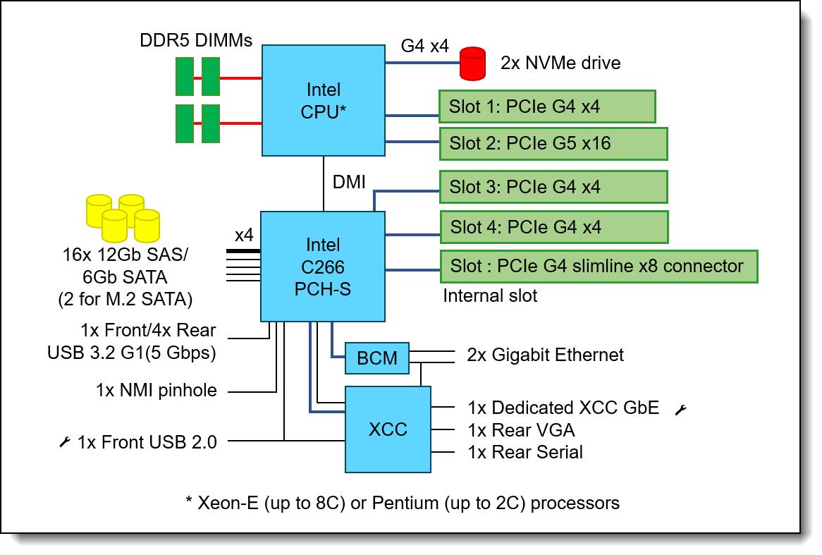 - 1x Intel Xeon 6353P (8-Core, 2.7 GHz, 65W), 1x ThinkSystem 16GB TruDDR5 5600MHz (1Rx8) ECC UDIMM