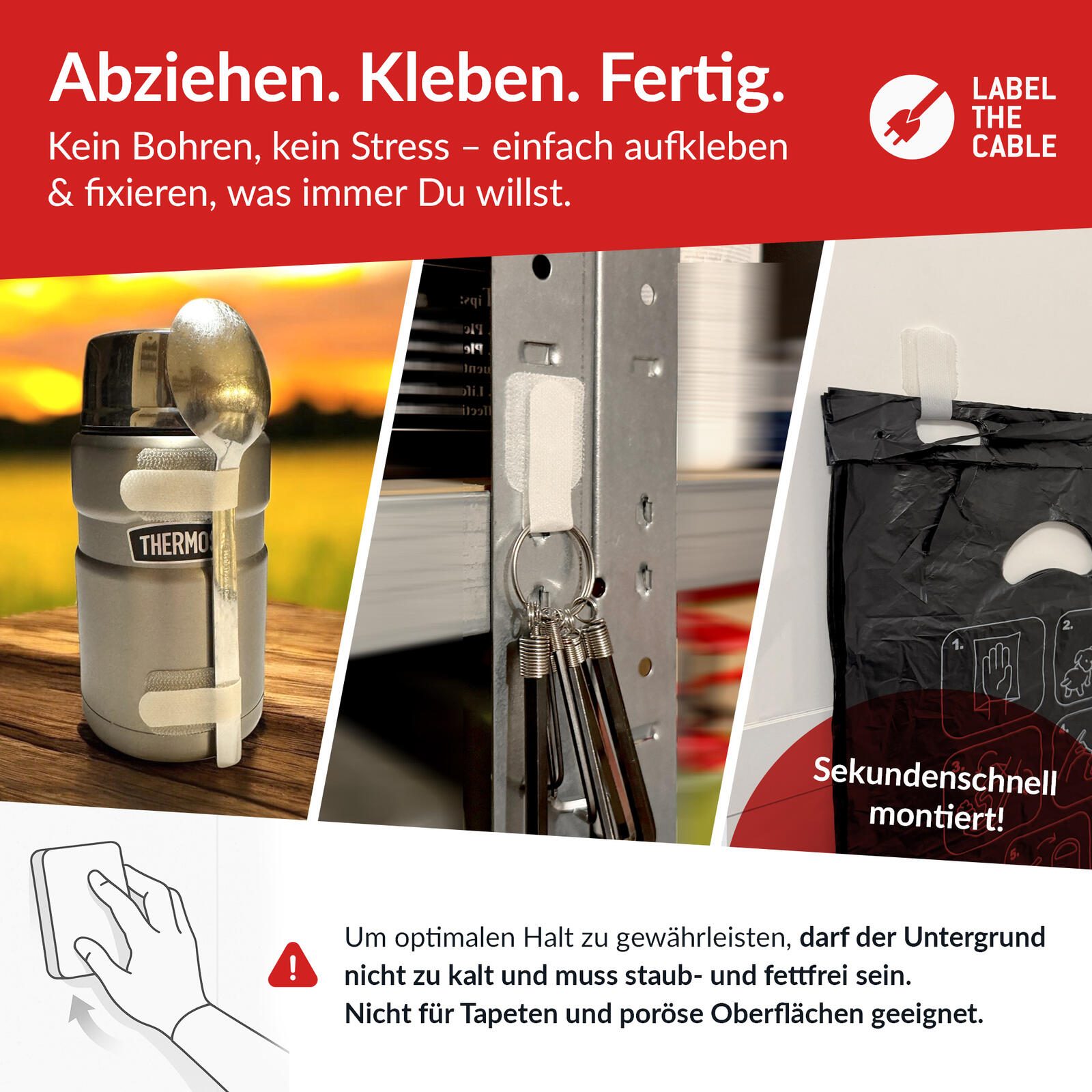 Die LABEL THE CABLE WALL STRAPS revolutionieren Ihr Kabelmanagement mit praktischer und flexibler Kabelführung ohne Bohren oder Werkzeug. Diese innovativen Kabelhalter mit einem Klebe-Fuß von (30 mm x 28 mm) und einer Klettlasche von (60 mm x 15 mm) kombiniert eine starke Klebefläche mit praktischem Klettverschluss für ein intelligentes Kabelmanagement in jedem Bereich. WALL STRAPS eignen sich aber auch zur Führung von Drähten, Schläuchen und Kletterpflanzen, oder zum Basteln und sind so maximal flexibel einsetzbar.
