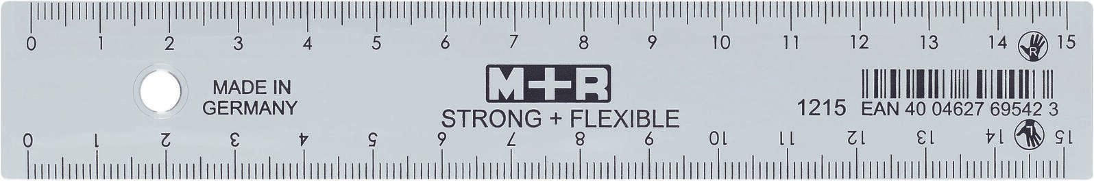 Das M + R Lineal 15 cm ist ein unverzichtbares Werkzeug für kreative Köpfe und präzise Planer. Mit seiner transparenten, glasklaren Farbe bietet es nicht nur eine ansprechende Optik, sondern ermöglicht dir auch eine optimale Sicht auf das, was du misst. Dieses Lineal ist aus bruchfestem Kunststoff gefertigt, was es besonders langlebig und widerstandsfähig macht. Du kannst es bedenkenlos im Schulranzen oder im Büro verstauen, ohne Angst vor Beschädigungen haben zu müssen. Ein herausragendes Merkmal des M + R Lineals ist die praktische Maßstabsunterteilung in Zentimetern und Millimetern. Egal, ob du ein Rechts- oder Linkshänder bist, das Lineal ist so konzipiert, dass es für alle Nutzer bequem in der Hand liegt. Die spezielle Facette und die Tuschekante sorgen dafür, dass deine Zeichnungen und Linien immer präzise und klar sind. So gelingen dir nicht nur einfache Messungen, sondern auch detaillierte Skizzen und Entwürfe. Dieses Lineal kommt ganz ohne Griff aus, was seine Handhabung besonders einfach und flexibel macht. Du kannst es mühelos an verschiedenen Orten einsetzen, sei es in der Schule, im Büro oder zu Hause. Das M + R Lineal 15 cm ist ein ideales Hilfsmittel für Schüler, Studenten, Künstler und alle, die Wert auf Genauigkeit legen. Es vereint Funktionalität mit einem modernen Design und ist somit ein Must-have für jeden Schreibtisch.Technische Daten