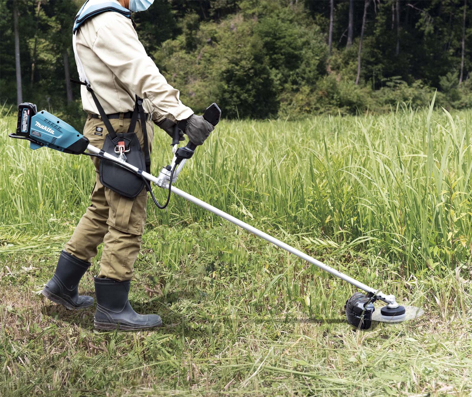 Leise und besonders durchzugsstarke Akku-Sense mit Zweihandgriff für den Grünschnitt auf großen Flächen