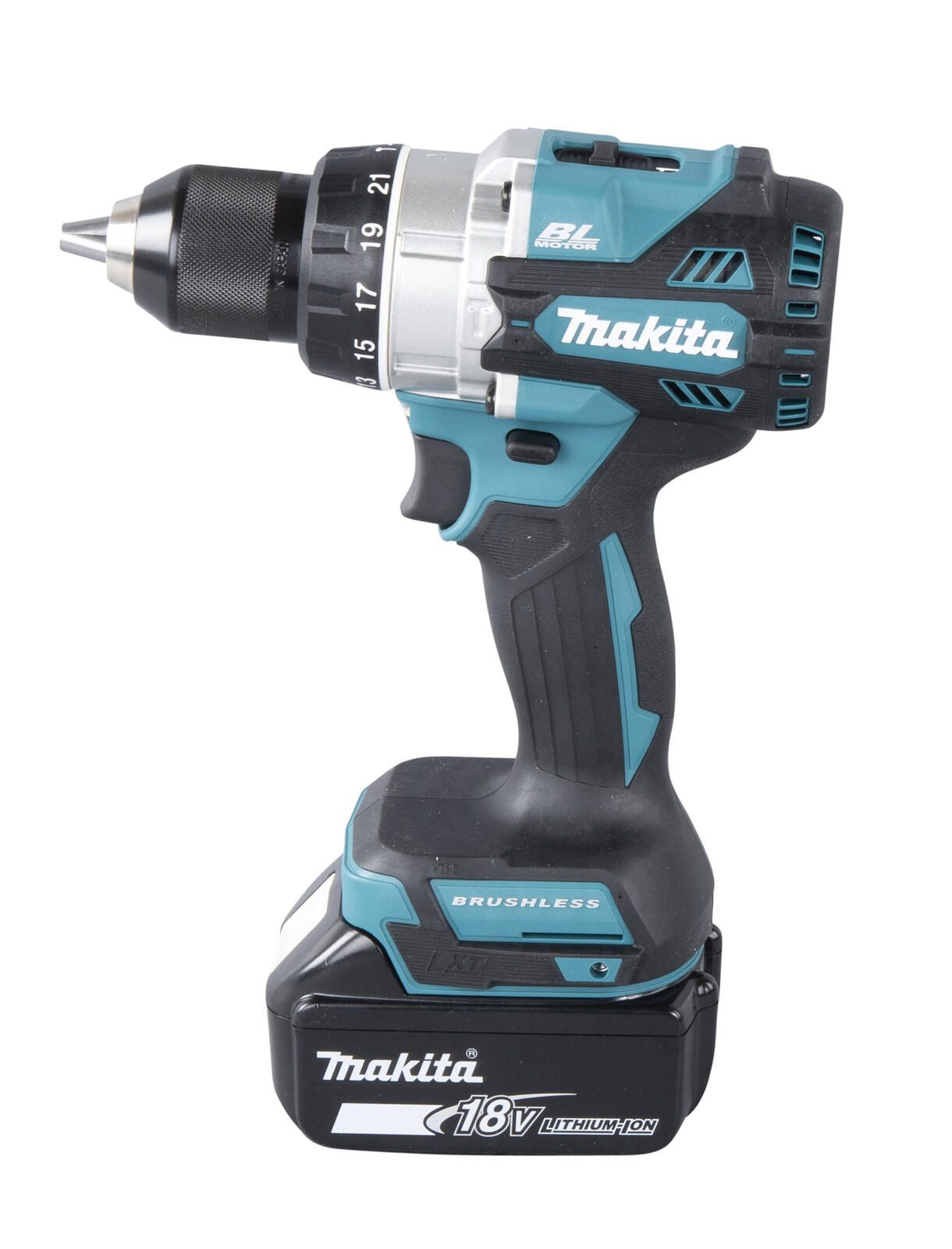 Zusätzlich ist der Akku-Schlagbohrschrauber mit einem elektronischen Überlastschutz ausgestattet, der das Gerät vor Schäden schützt und somit die Lebensdauer verlängert. Das Set wird in einem ansprechenden blau/schwarz geliefert und enthält alles, was Sie für den sofortigen Einsatz benötigen: zwei Akkus BL1850B Li mit 18V und 5,0 Ah, ein Schnellladegerät DC18RC, einen MAKPAC der Größe 2, einen Tiefenanschlag, einen Seitengriff, eine Schraube M4x12, einen Einhängbügel sowie einen Bit-Halter mit PH/LS Doppelbit.
