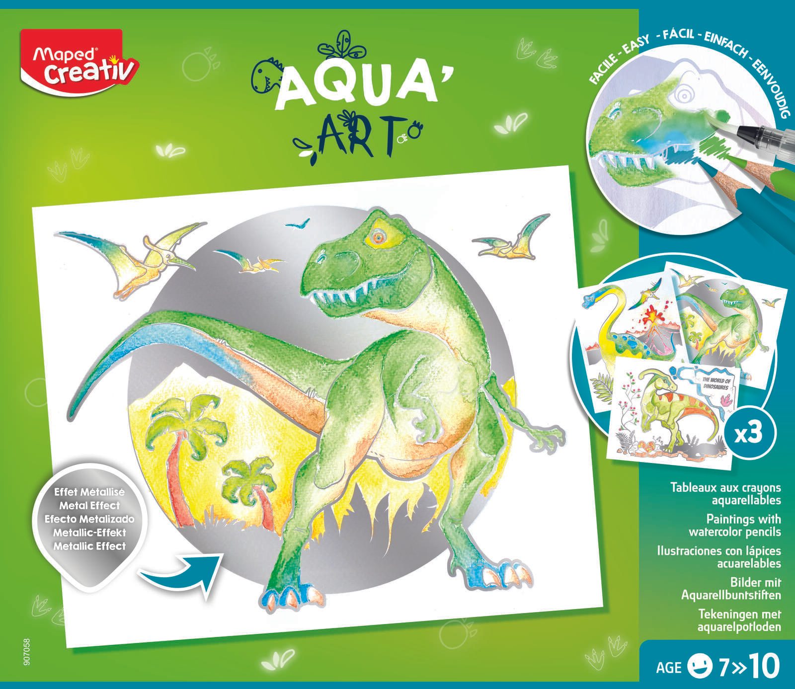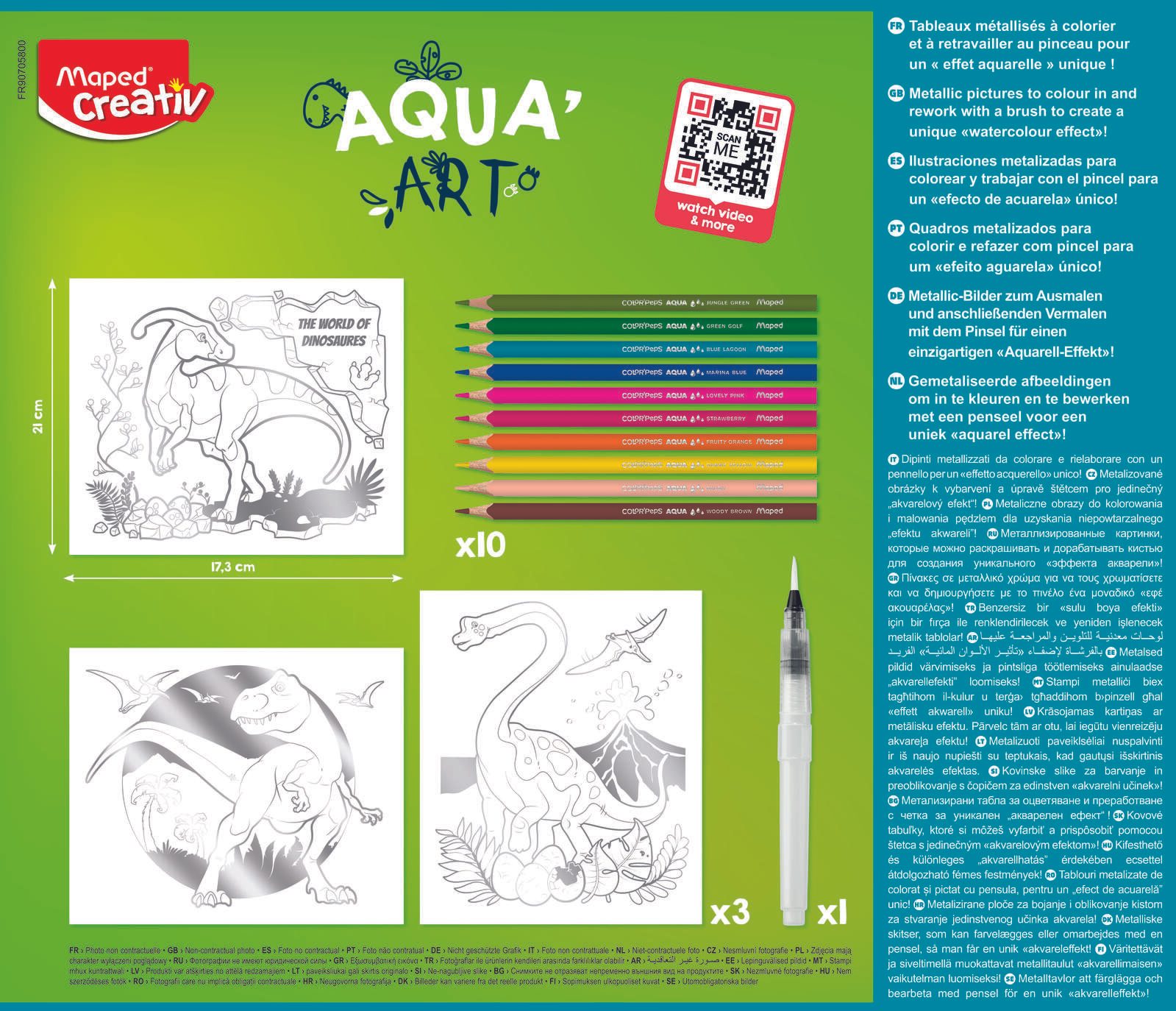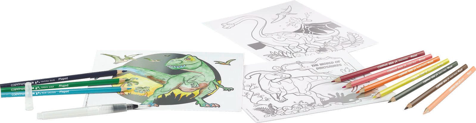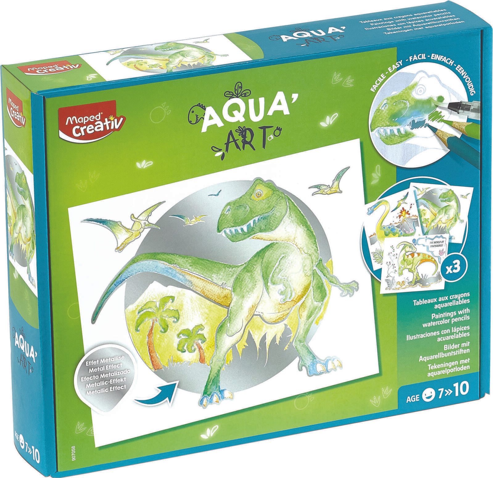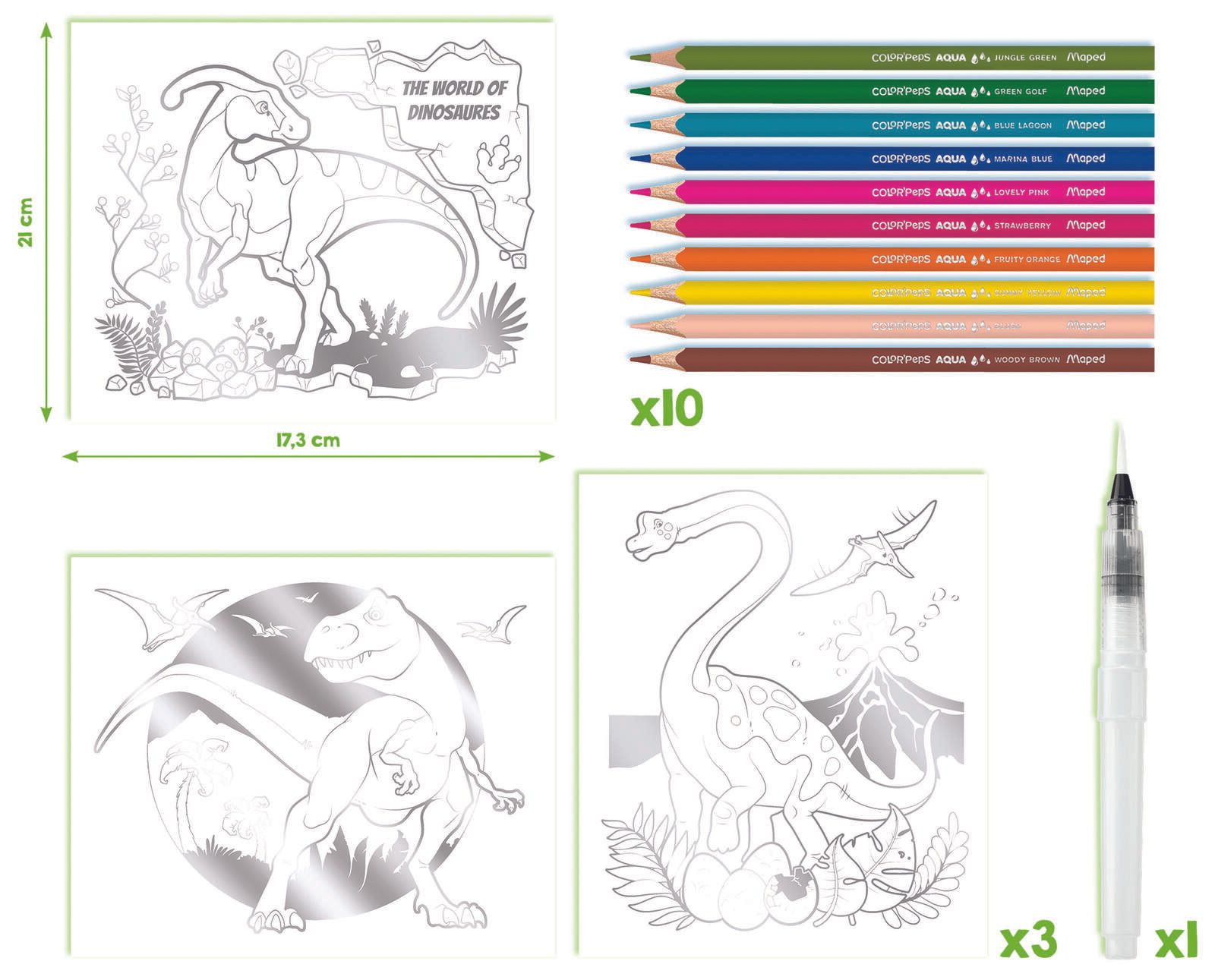 Erwecke deine Kreativität mit dem Maped AQUA'ART Dino 14-teiligen Set zum Leben. Dieses Set enthält einen Wassertankpinsel, 3 Zeichenvorlagen mit Dinosauriern im Metallic-Effekt und 10 Aquarellstifte in 10 verschiedenen Farben. Tauche ein in die Welt der Dinosaurier und erschaffe faszinierende Kunstwerke.