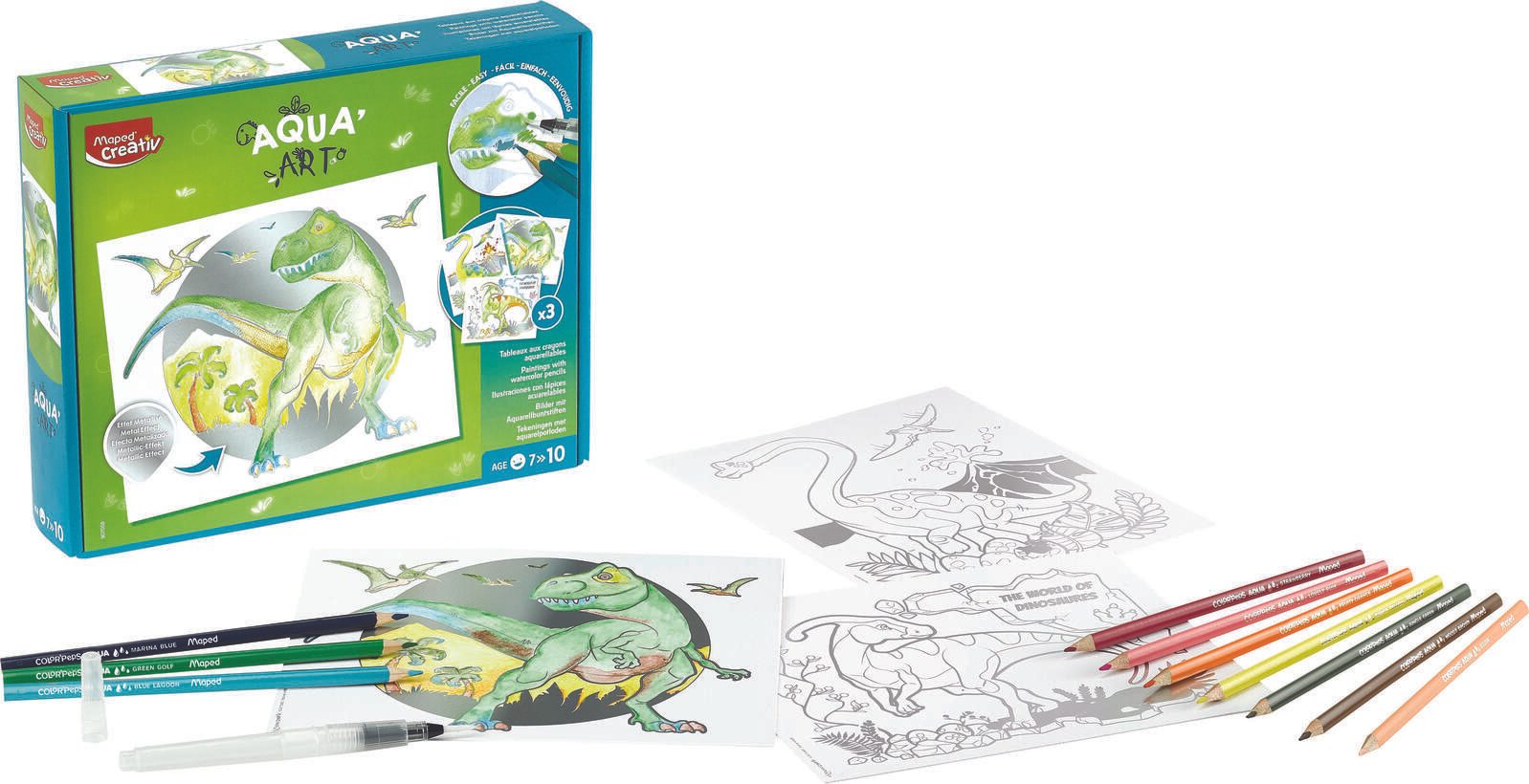 - Inhalt: Wassertankpinsel, 3 Zeichenvorlagen mit Dinosauriern im Metallic-Effekt und 10 Aquarellstifte