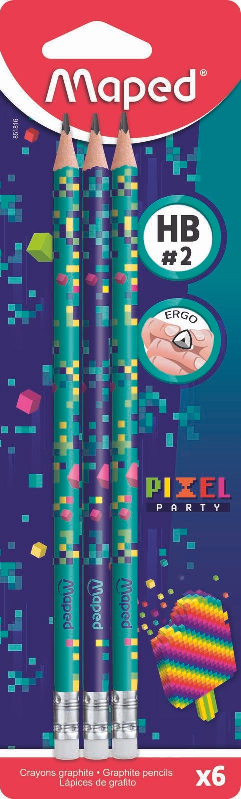Die maped Bleistifte PIXEL PARTY sind die ideale Wahl für kreative Köpfe und kleine Künstler. Mit ihrem dreikantigen Design bieten diese Bleistifte nicht nur eine ergonomische Handhabung, sondern auch einen optimalen Schreibkomfort für sowohl Rechts- als auch Linkshänder. Die Schaftfarbe in lebhaftem Grün und Violett bringt Farbe in jeden Zeichenblock und macht das Schreiben und Zeichnen zu einem bunten Erlebnis. Die hohe Minenstabilität und Bruchfestigkeit der Bleistifte garantieren eine langanhaltende Nutzung, sodass du dich voll und ganz auf deine kreativen Ideen konzentrieren kannst, ohne ständig nach einem neuen Stift greifen zu müssen. Mit dem Härtegrad HB sind die maped Bleistifte PIXEL PARTY vielseitig einsetzbar – ob für Skizzen, Notizen oder detaillierte Zeichnungen. Jede Packung enthält sechs Bleistifte, die perfekt für den Schulbedarf oder für das kreative Arbeiten zu Hause geeignet sind. Die Standardausführung der Stifte sorgt dafür, dass du immer bereit bist, deine Gedanken und Ideen festzuhalten. Die Serie PIXEL PARTY hebt sich durch ihr modernes und ansprechendes Design hervor, das sowohl Kinder als auch Erwachsene anspricht. Entdecke die Freude am Zeichnen und Schreiben mit den maped Bleistiften PIXEL PARTY und lass deiner Kreativität freien Lauf.Technische Daten