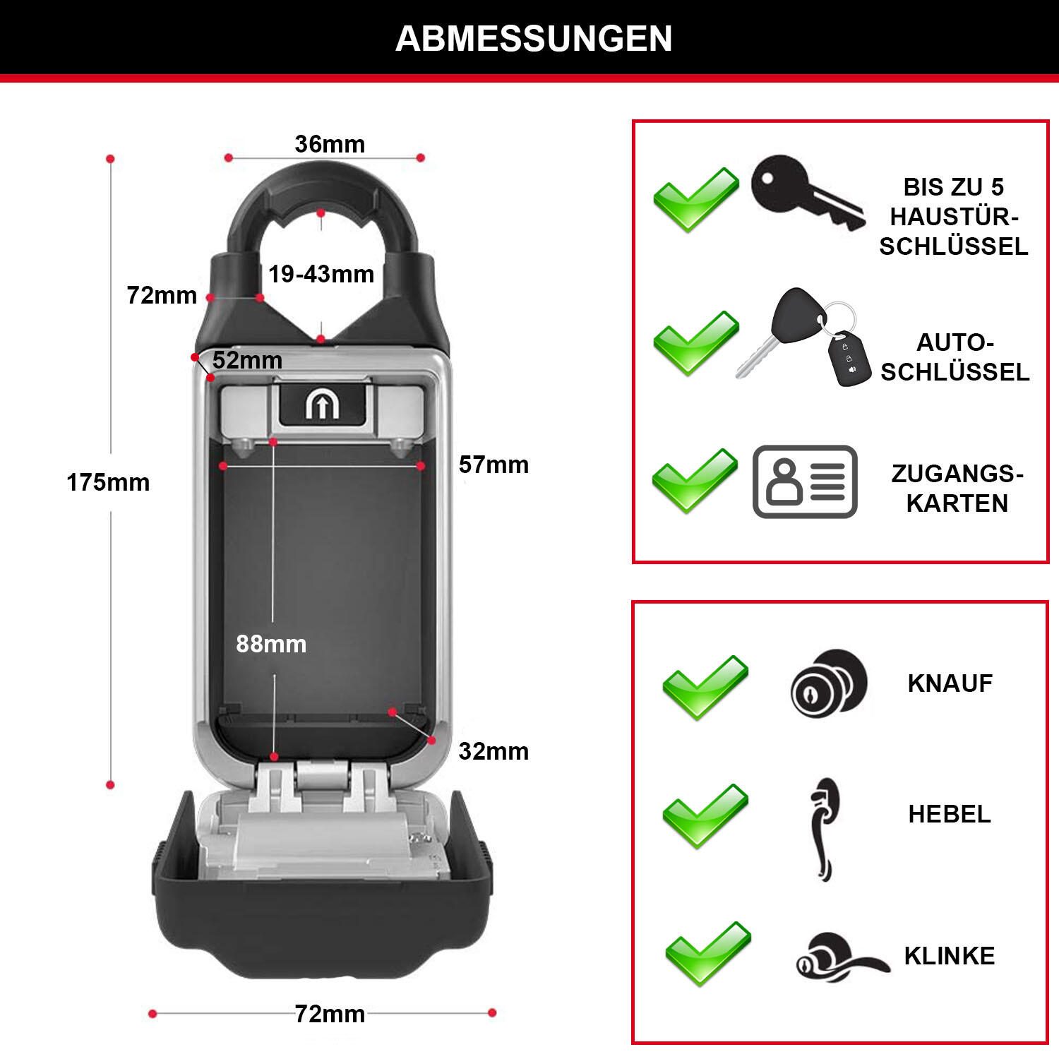 Die abschließbare Einheit verfügt über ein Zahlenschloss, das eine einfache und sichere Handhabung ermöglicht, ohne dass ein zusätzlicher Schlüssel benötigt wird. Das Innere des Tresors bietet ausreichend Platz für bis zu fünf Haustürschlüssel, Autoschlüssel oder Zugangskarten. Die Befestigung erfolgt über vier Bohrungen in der Rückwand, die eine stabile und dauerhafte Montage gewährleisten.