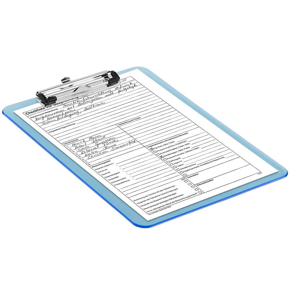 Die Abmessungen des Klemmbretts betragen 31,8 cm in der Breite, 22,6 cm in der Tiefe und 1,5 cm in der Höhe. Dank seiner Farbe in durchsichtigem Blau fällt das Klemmbrett sofort ins Auge und verleiht deinem Arbeitsplatz eine gewisse Frische.