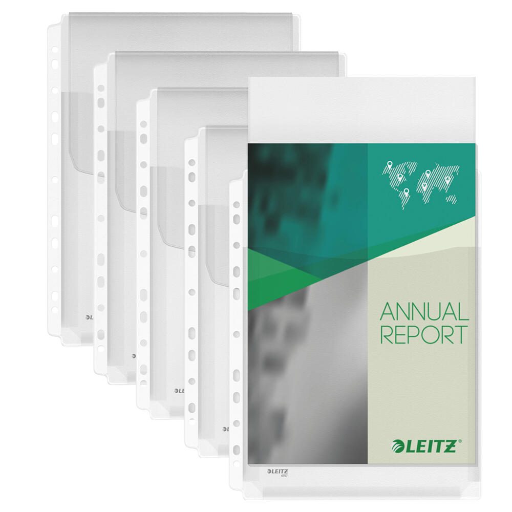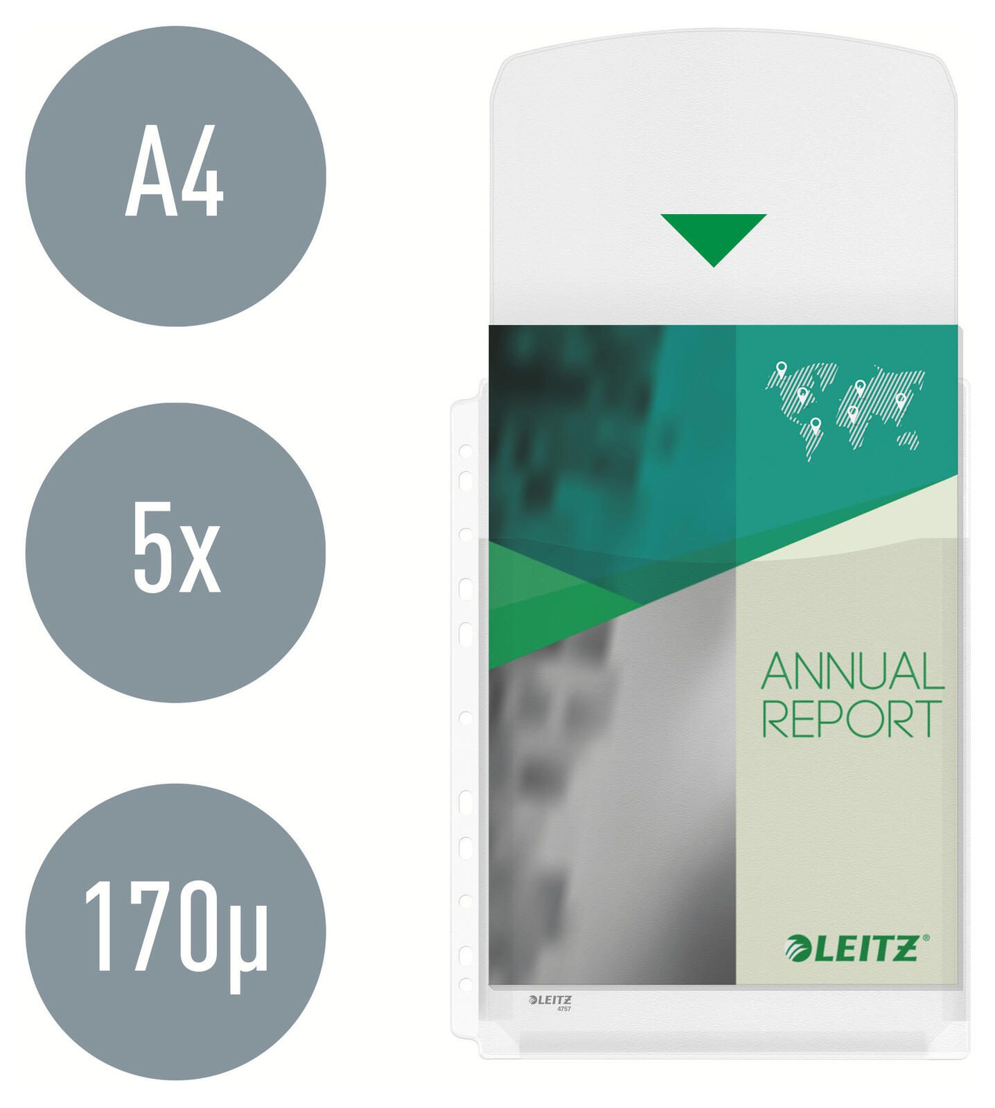 Die LEITZ Prospekthüllen DIN A4 sind die ideale Lösung, um deine Dokumente sicher und stilvoll aufzubewahren. Mit einem robusten Material aus PVC-Weichfolie bieten diese Hüllen nicht nur Schutz, sondern auch eine ansprechende Optik durch ihre transparente Farbgestaltung. Egal, ob für den Büroalltag, die Schule oder den privaten Bereich, diese Prospekthüllen sind vielseitig einsetzbar und überzeugen durch ihre hohe Qualität. Die Ausführung mit Klappe und einer praktischen 2,0 cm Seitenfalte ermöglicht ein einfaches Abheften und sorgt dafür, dass deine Unterlagen stets an ihrem Platz bleiben. Dank der Universal-Lochung sind die Hüllen mit den meisten Ordnersystemen kompatibel und lassen sich problemlos in bestehende Ablagesysteme integrieren. Die Öffnung an der Oberseite erleichtert das Einlegen und Entnehmen von Dokumenten, sodass du jederzeit schnell auf die benötigten Informationen zugreifen kannst. Ein weiteres Highlight dieser Prospekthüllen ist der integrierte Verschluss, der zusätzlichen Schutz bietet und ein ungewolltes Herausfallen der Inhalte verhindert. Die genarbte Oberfläche sorgt nicht nur für eine angenehme Haptik, sondern verleiht den Hüllen auch eine ansprechende Struktur. Mit einem Pack von fünf Stück bist du bestens ausgestattet, um deine wichtigsten Unterlagen ordentlich und übersichtlich zu organisieren. Die LEITZ Prospekthüllen DIN A4 0.17 mm transparent sind die perfekte Wahl für alle, die Wert auf Qualität und Funktionalität legen.Technische Daten