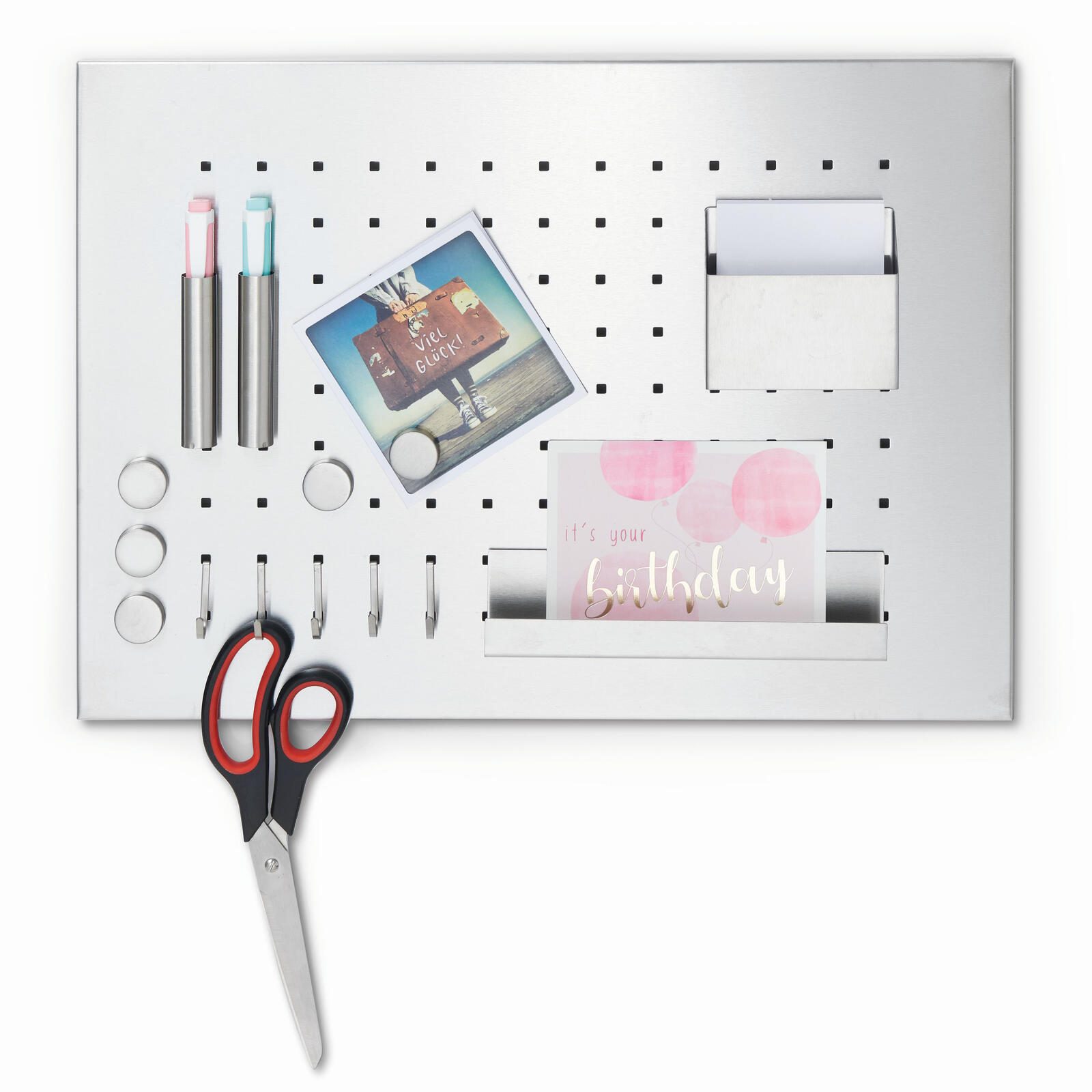 Die Tafeloberfläche aus hochwertigem Edelstahl in silberfarbenem Farbton verleiht jedem Raum ein modernes und ansprechendes Erscheinungsbild. Der Hersteller Zeller steht für Qualität und Funktionalität, was sich auch bei diesem Memoboard mit Utensilienhalterung zeigt.