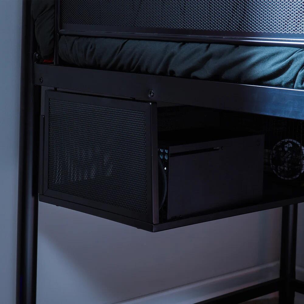 - Unterbett-Stauraumregal: Enthält einen Stauraum unter dem Gestell mit belüfteten Netzpaneelen zur Aufbewahrung von Spielkonsolen, Zubehör und PC-Hardware. So bleibt alles ordentlich und sicher!