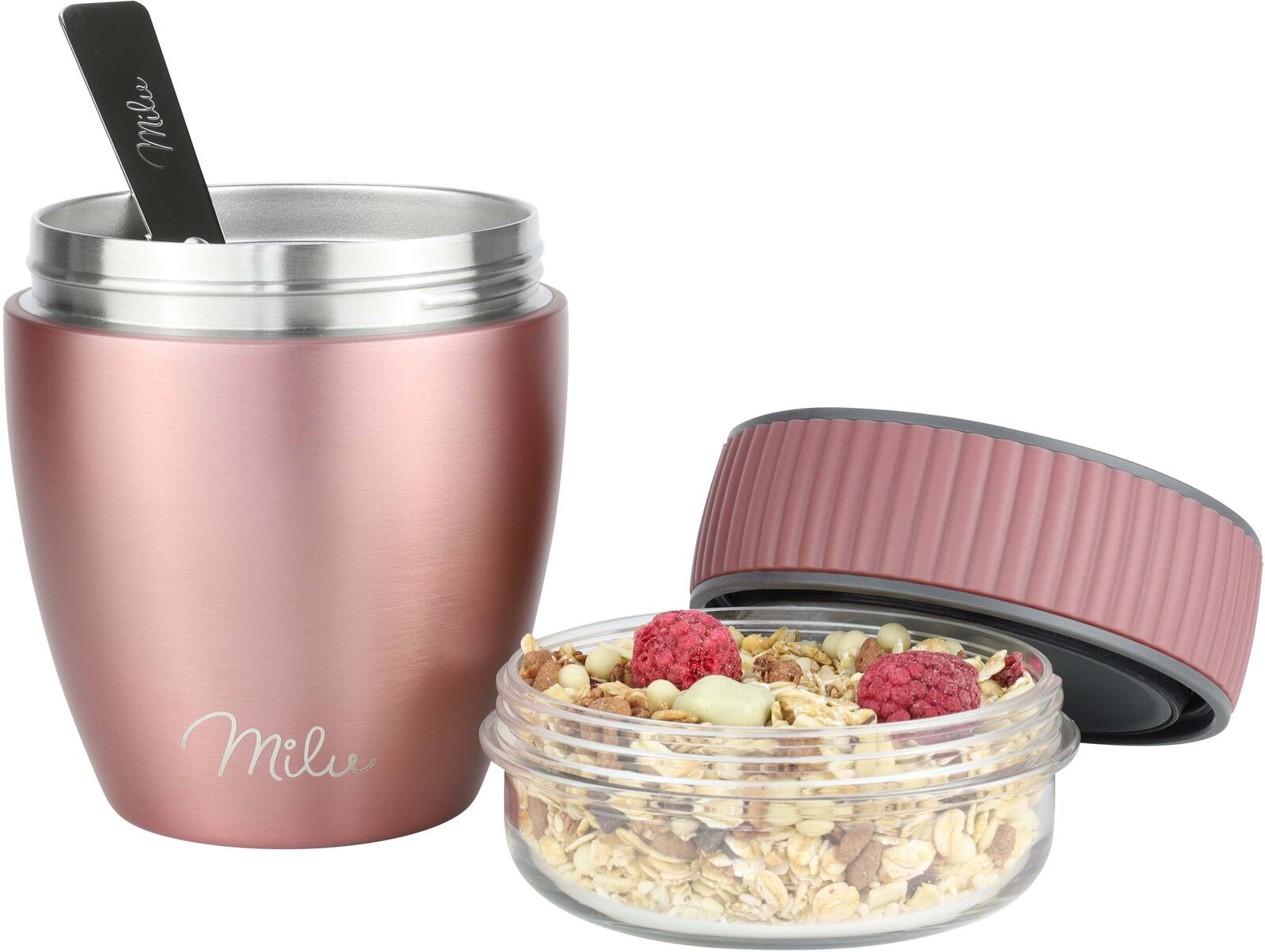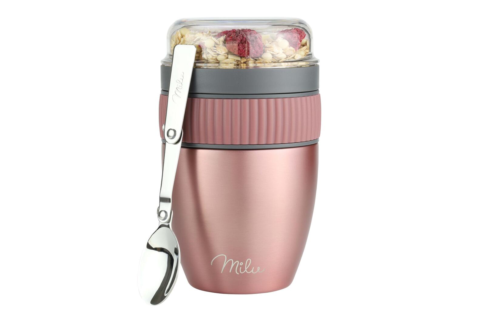 MILU ISOLIER-EDELSTAHL-MÜSLIBECHER-SET TO GO 400 ML (3-TLG.) MIT EDELSTAHLLÖFFEL UND DRUCKABLASSVENTIL