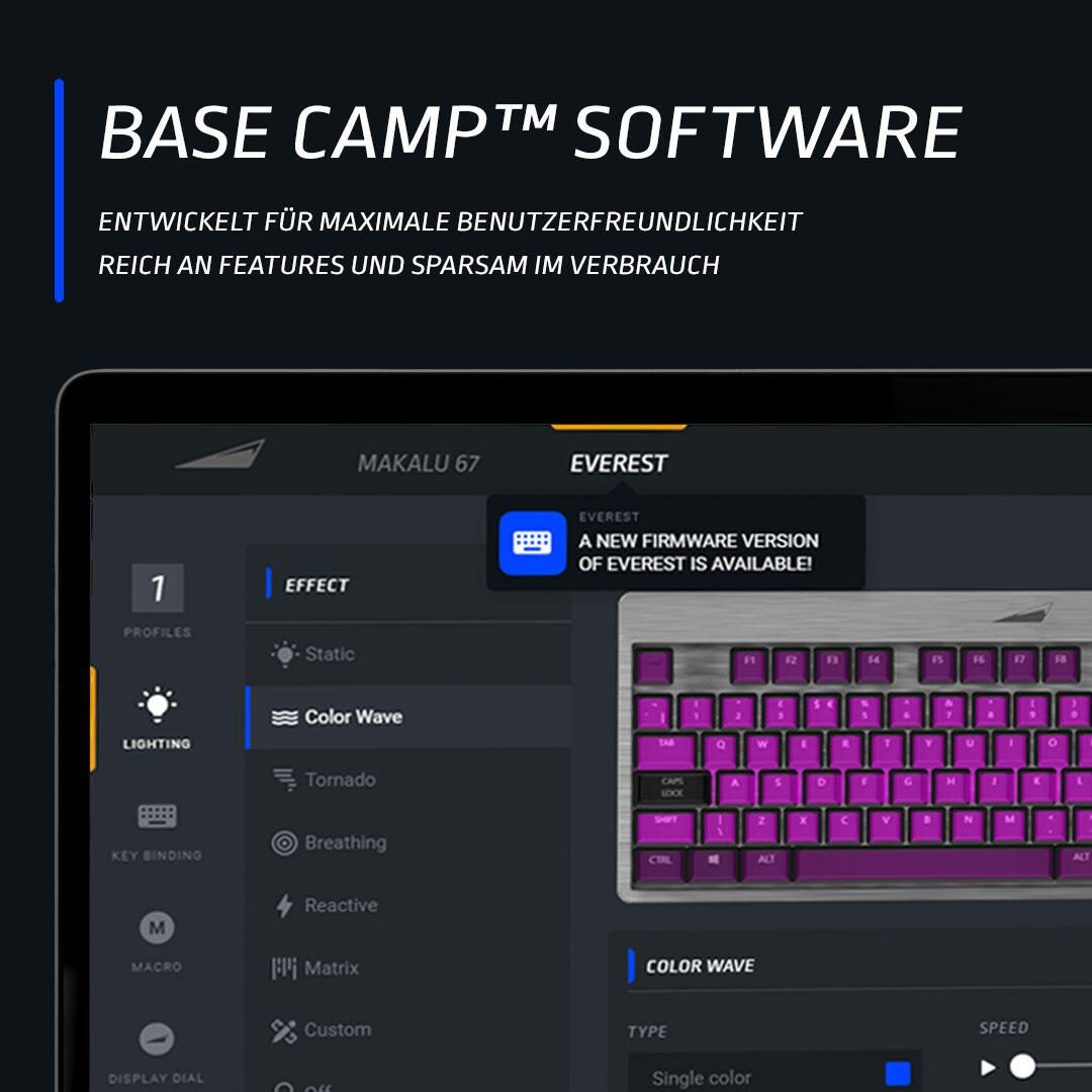 MACHEN SIE SICH IM BASE CAMP ™ VORBEREITETDein Everest wird von unserer Software Base Camp ™ unterstützt , die von Grund auf entworfen und entwickelt wurde, um dich mit allen Werkzeugen auszustatten, die du für deinen Aufstieg benötigst. Das primäre Designziel von Base Camp ™ bestand darin, Benutzerfreundlichkeit und Flexibilität in Einklang zu bringen, damit Sie Ihre Everest-Tastatur genau so einrichten können, wie Sie es möchten, ohne Ihnen im Weg zu stehen. Basislager ™ beinhaltet: