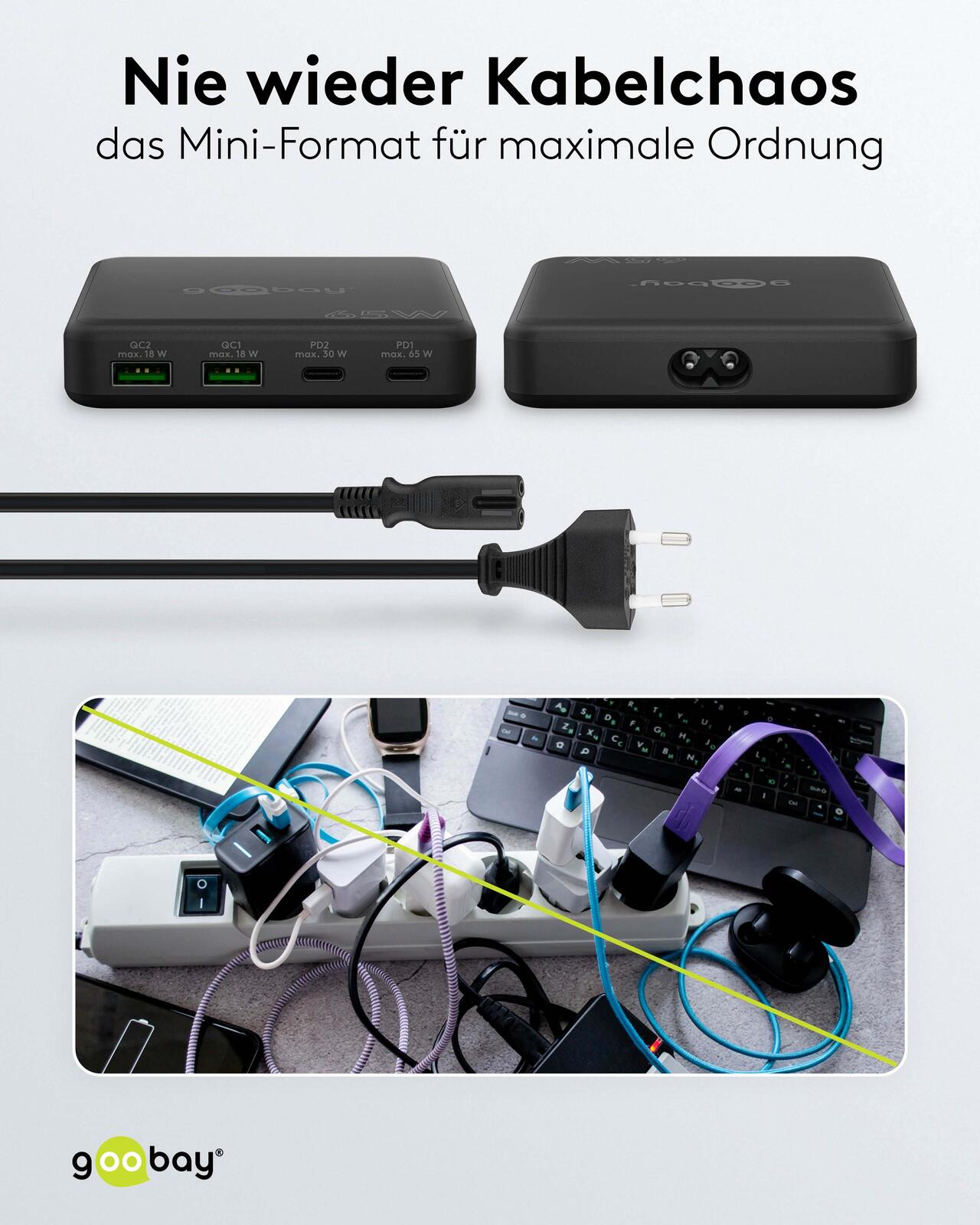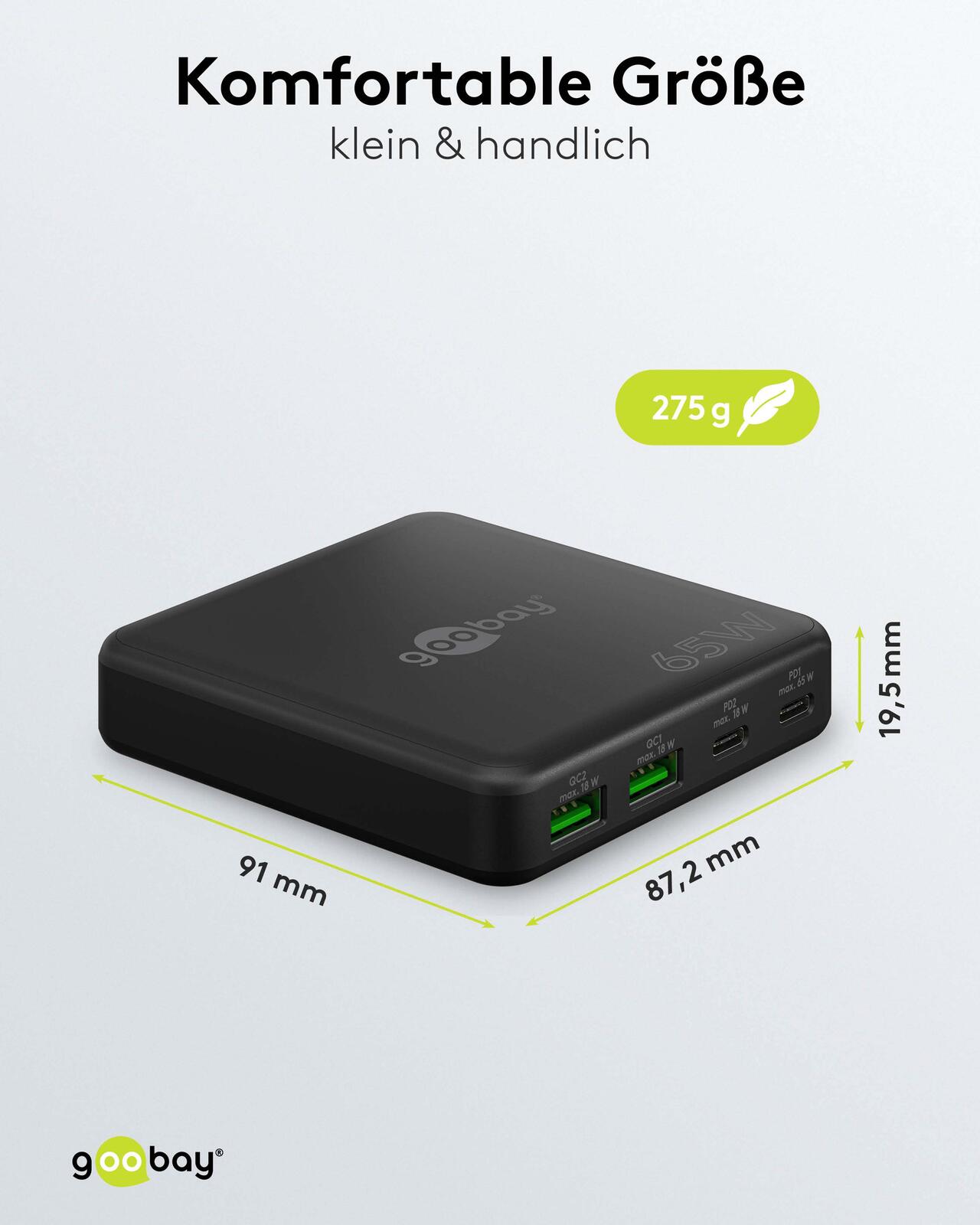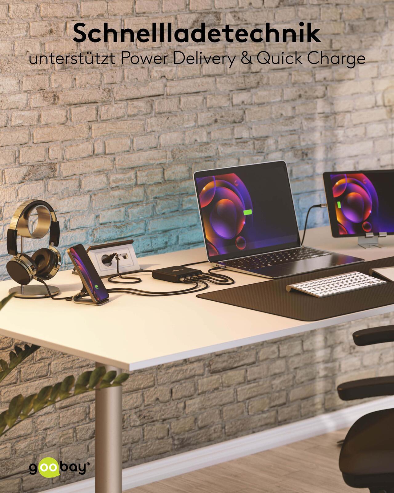 • Galliumnitrid (GaN)-Halbleiter, Unterstützt das gleichzeitige Laden von bis zu 4 Geräten, Der Schnelllademodus versorgt Laptops wie das Apple MacBook per USB-C™ Power Delivery und lädt gleichzeitig Smartphones über USB-A Quick Charge mit