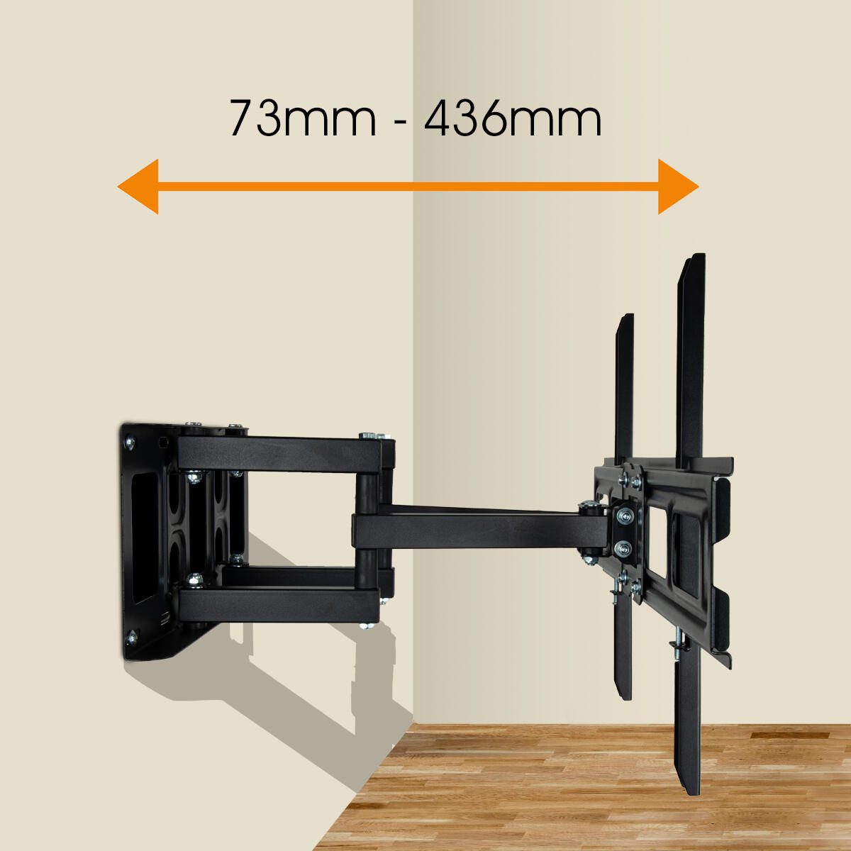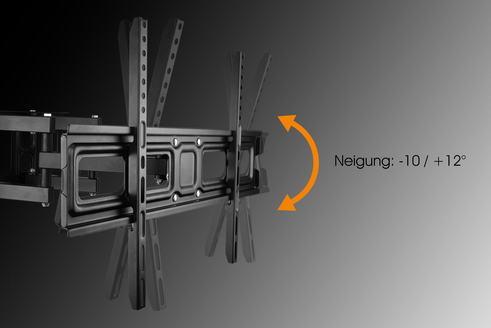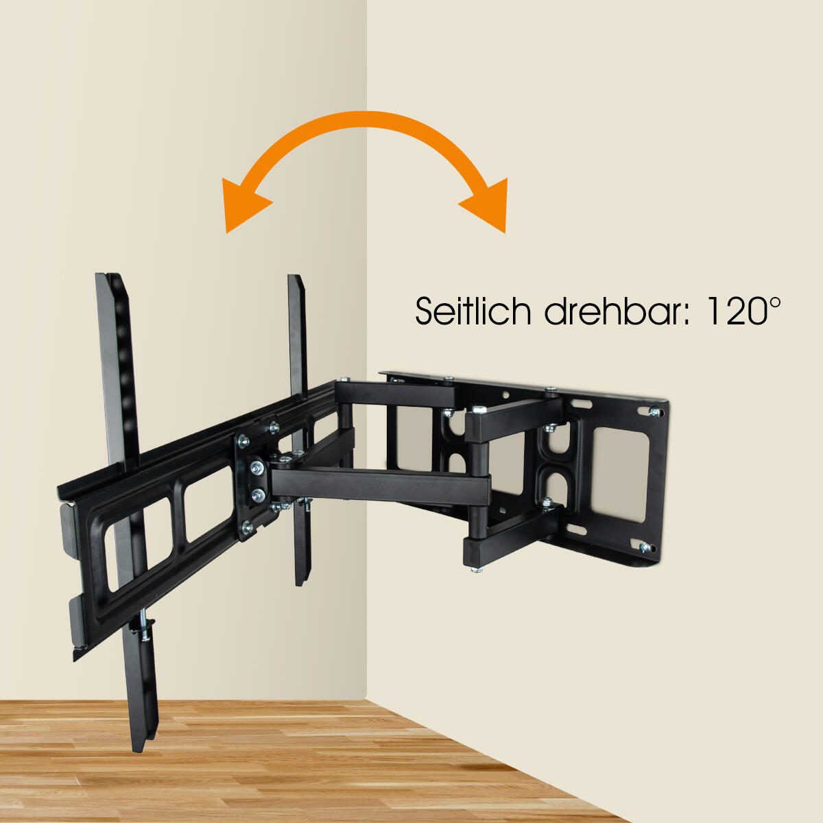 Zusätzlich ist die Halterung seitlich um bis zu 120° drehbar, sodass Sie den Fernseher bequem in verschiedene Richtungen ausrichten können. Der Wandabstand ist variabel und reicht von 72 mm bis 435 mm, was eine flexible Anpassung an unterschiedliche Raumgegebenheiten erlaubt. Die robuste Bauweise gewährleistet eine sichere Montage und sorgt für eine langlebige Nutzung.