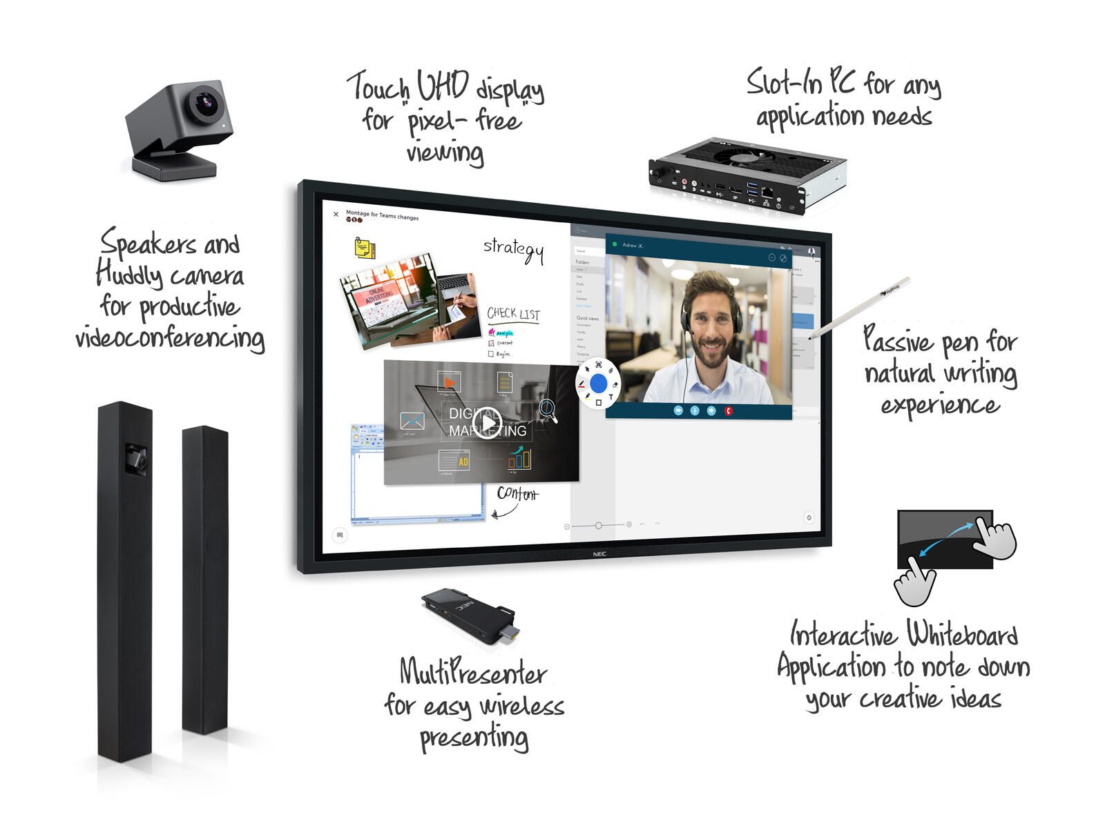 NEC InfinityBoard 65" - Kit für Videokonferenzen - mit NEC MultiPresenter Stick (MP10RX), OPS Slot-in PC, Speaker 651SM, 2 Passive Pens