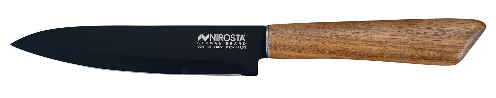 Das NIROSTA Küchenmesser Flow Fair in elegantem Schwarz überzeugt durch seine hochwertige Verarbeitung und vielseitige Einsatzmöglichkeiten. Mit einer Gesamtlänge von 24 cm und einer 13,5 cm langen, geraden Klinge aus robustem Edelstahl bietet es optimale Schneidleistung für verschiedenste Küchenaufgaben. Der ergonomisch geformte Holzgriff sorgt für eine angenehme Haptik und sicheren Halt, was das Arbeiten in der Küche besonders komfortabel macht.