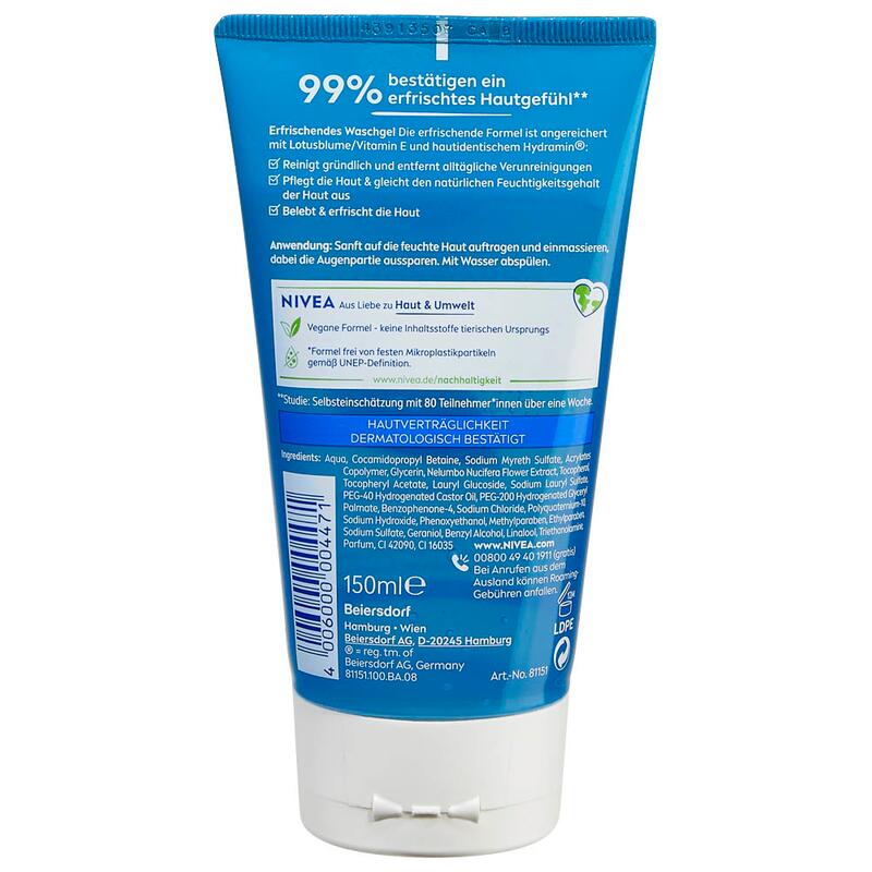 Das NIVEA ERFRISCHEND Waschgel bietet eine sanfte und zugleich gründliche Reinigung für alle Hauttypen. Mit seiner besonderen Formel, die Lotusblume, Vitamin E und hautidentisches Hydramin® kombiniert, sorgt es dafür, dass Ihre Haut nicht nur gereinigt, sondern auch optimal gepflegt wird. Dieses Waschgel entfernt zuverlässig alltägliche Verunreinigungen und gleicht gleichzeitig den natürlichen Feuchtigkeitsgehalt der Haut aus, wodurch Spannungsgefühle vermieden werden.