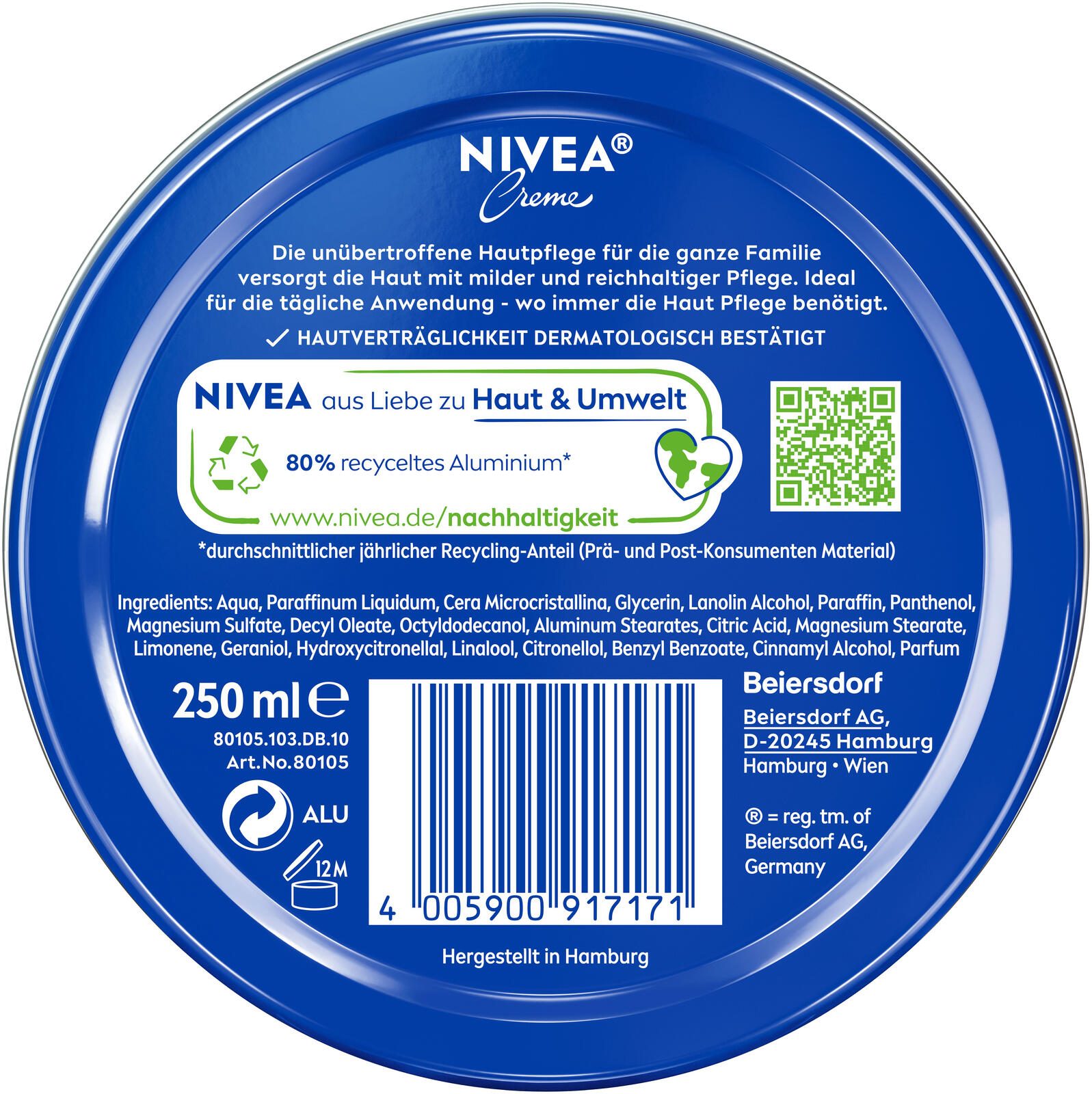 Die bewährte Formel der NIVEA Creme schützt die Haut vor dem Austrocknen und unterstützt die natürliche Hautbarriere. Dabei wird ein angenehmer, klassischer NIVEA-Duft freigesetzt, der für ein vertrautes und wohltuendes Pflegeerlebnis sorgt. Die Verpackung besteht zu 80 % aus recyceltem Aluminium, was einen Beitrag zur Nachhaltigkeit leistet.
