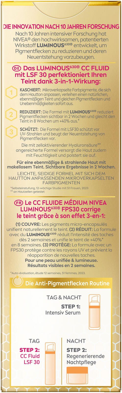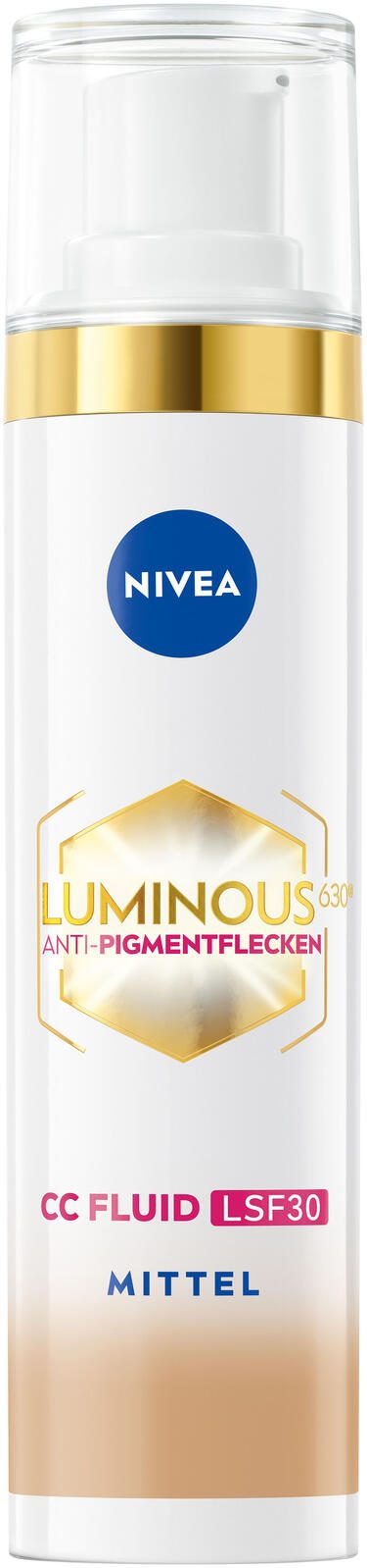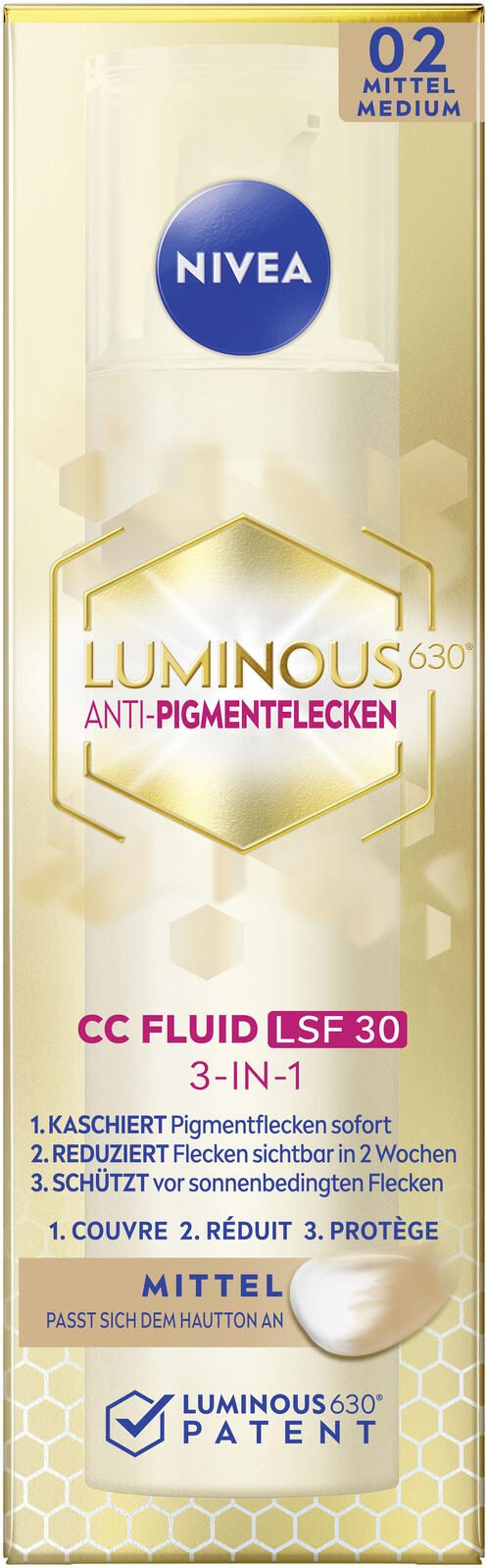 Das NIVEA LUMINOUS630® 3in1 MITTEL Gesichtsfluid verbindet dermatologisch bestätigte Hautpflege mit einer innovativen Anti-Pigmentflecken-Formel. Dieses leichte CC Fluid kaschiert Pigmentflecken sofort und sorgt durch mikroverkapselte Farbpigmente für eine natürlich wirkende, dem Hautton angepasste Deckkraft. So wird ein ebenmäßiger Teint erzielt, der gleichzeitig sanft zur Haut ist.