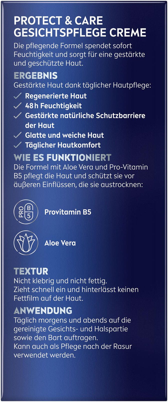 Die NIVEA MEN PROTECT & CARE 48H FEUCHTIGKEIT Gesichtscreme bietet eine intensive Feuchtigkeitspflege, die speziell auf die Bedürfnisse der Männerhaut abgestimmt ist. Mit ihrer schnell einziehenden, nicht fettenden Formel versorgt sie die Haut bis zu 48 Stunden lang mit Feuchtigkeit und sorgt für ein angenehm gepflegtes Hautgefühl. Die Creme enthält natürliche Aloe Vera, die beruhigend wirkt, sowie Pro-Vitamin B5, das die natürliche Schutzbarriere der Haut stärkt und die Haut widerstandsfähiger macht.